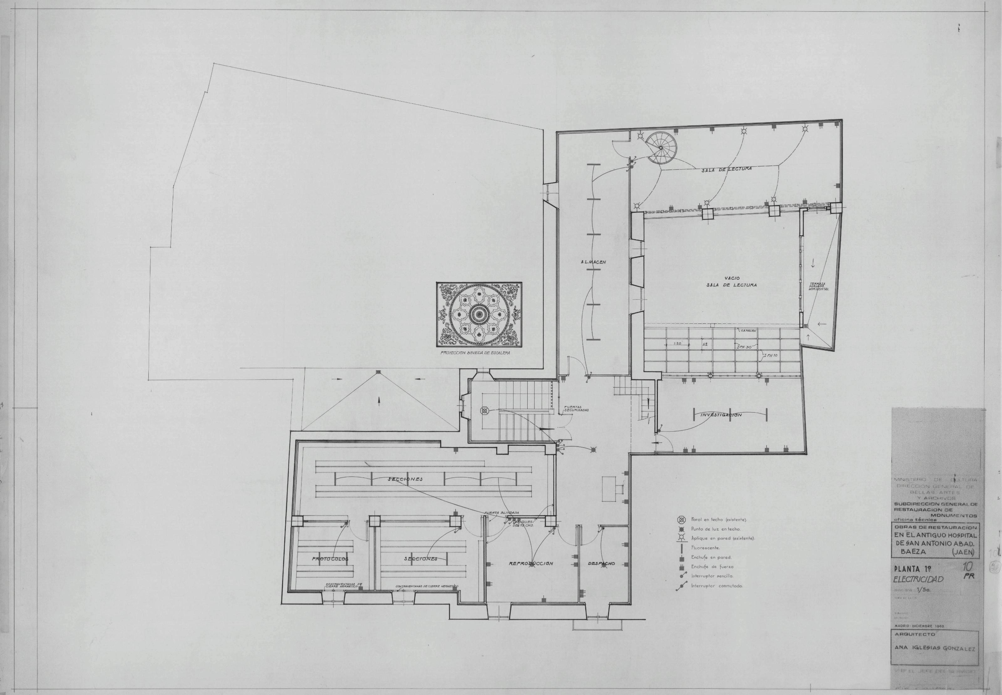 HOSPITAL DE SAN ANTONIO ABAD. BAEZA.: PLANTA PRIMERA ELECTRICIDAD. Plano donde aparece toda la distribucion de electricidad en planta, junto con una leyenda, Plano sin cotas,