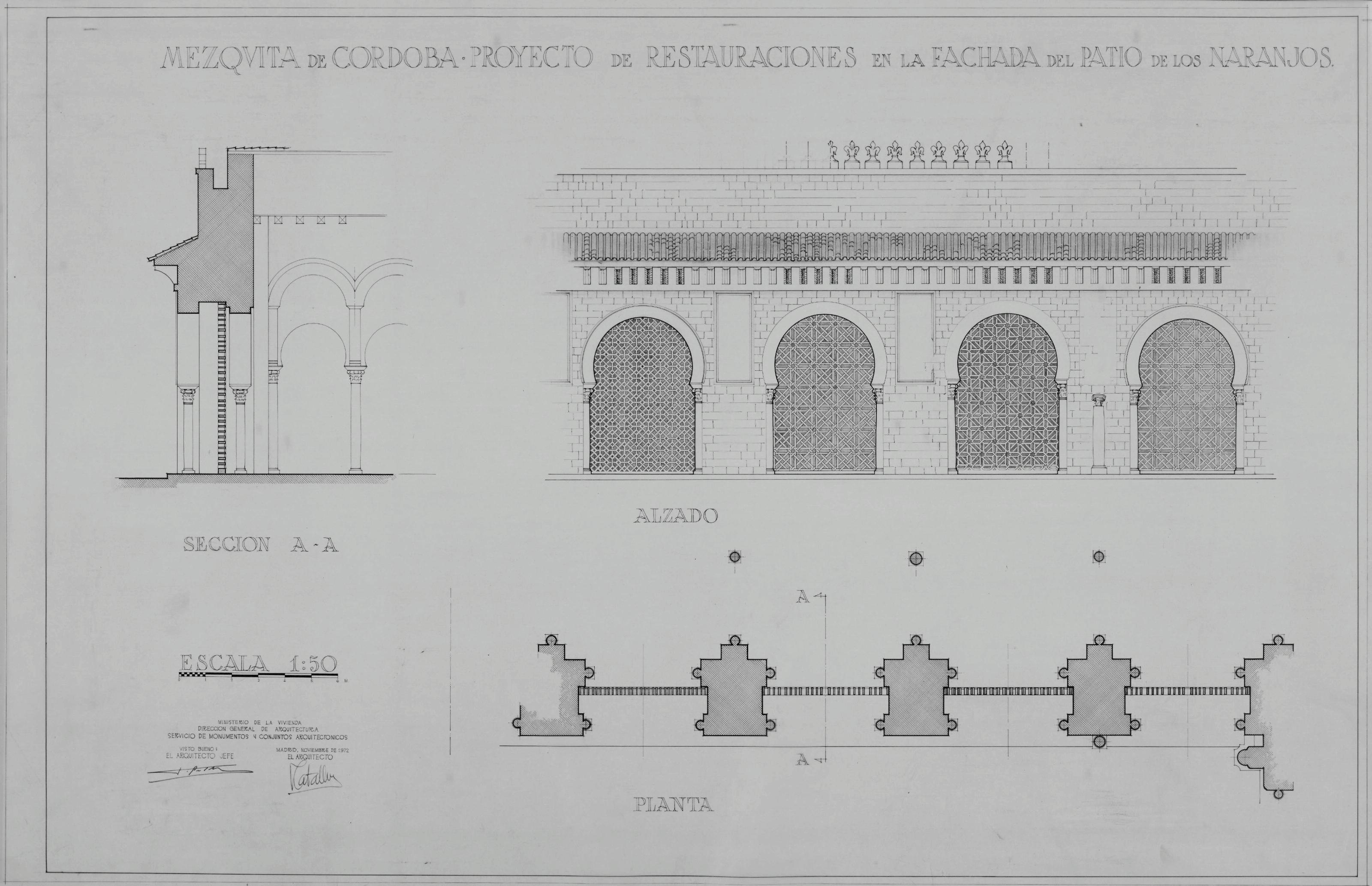 MEZQUITA IGLESIA CATEDRAL DE LA ASUNCION DE NUESTRA SEÑORA CORDOBA: SECCIONES DETALLES DE CELOSIAS RESTAURACION EN LA FACHADA DEL PATIO DE LOS NARANJOS