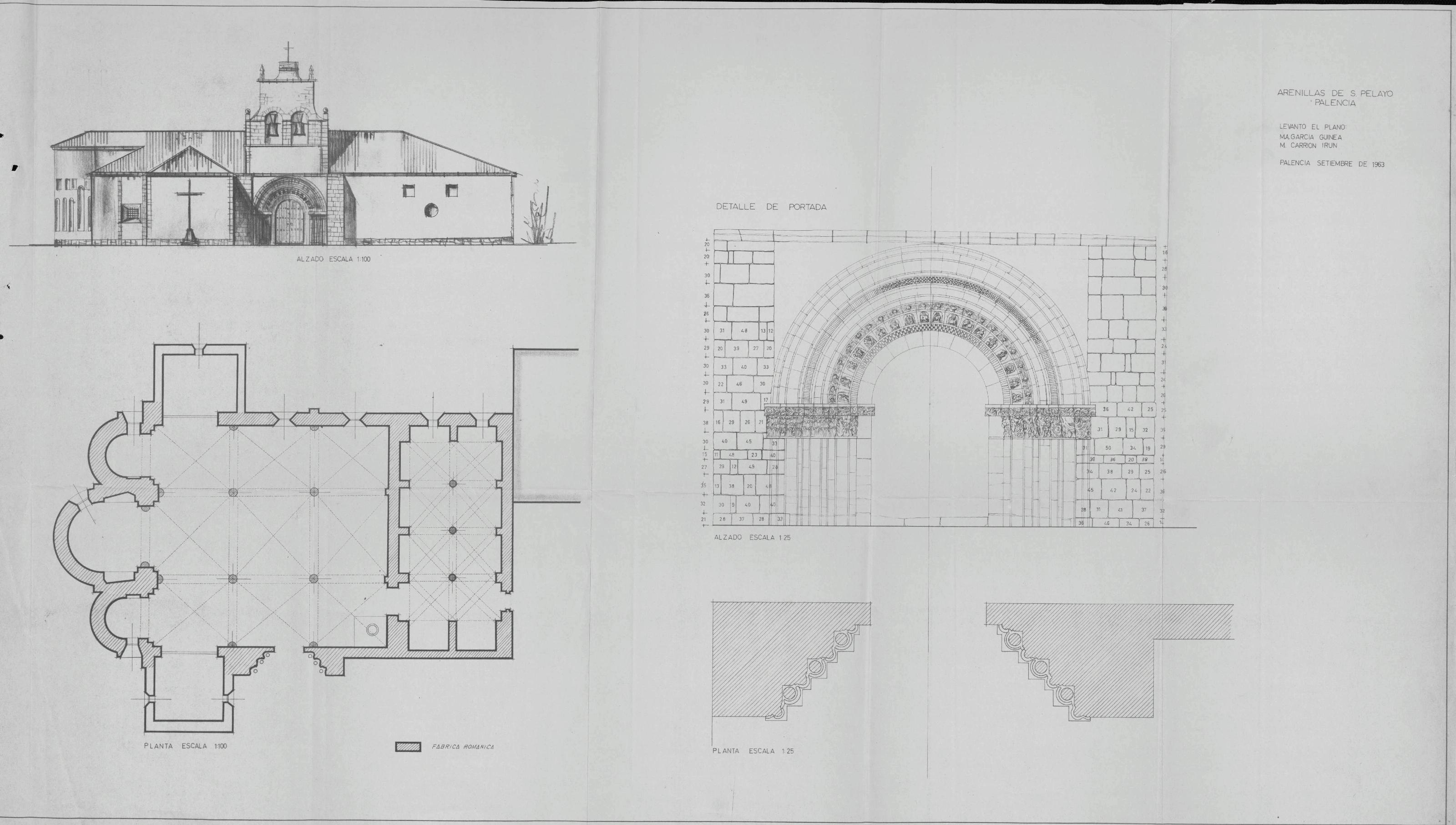Iglesia Parroquial,. Arenillas de San Pelayo. Palencia.: Planta general, alzado principal y detalle de portada.