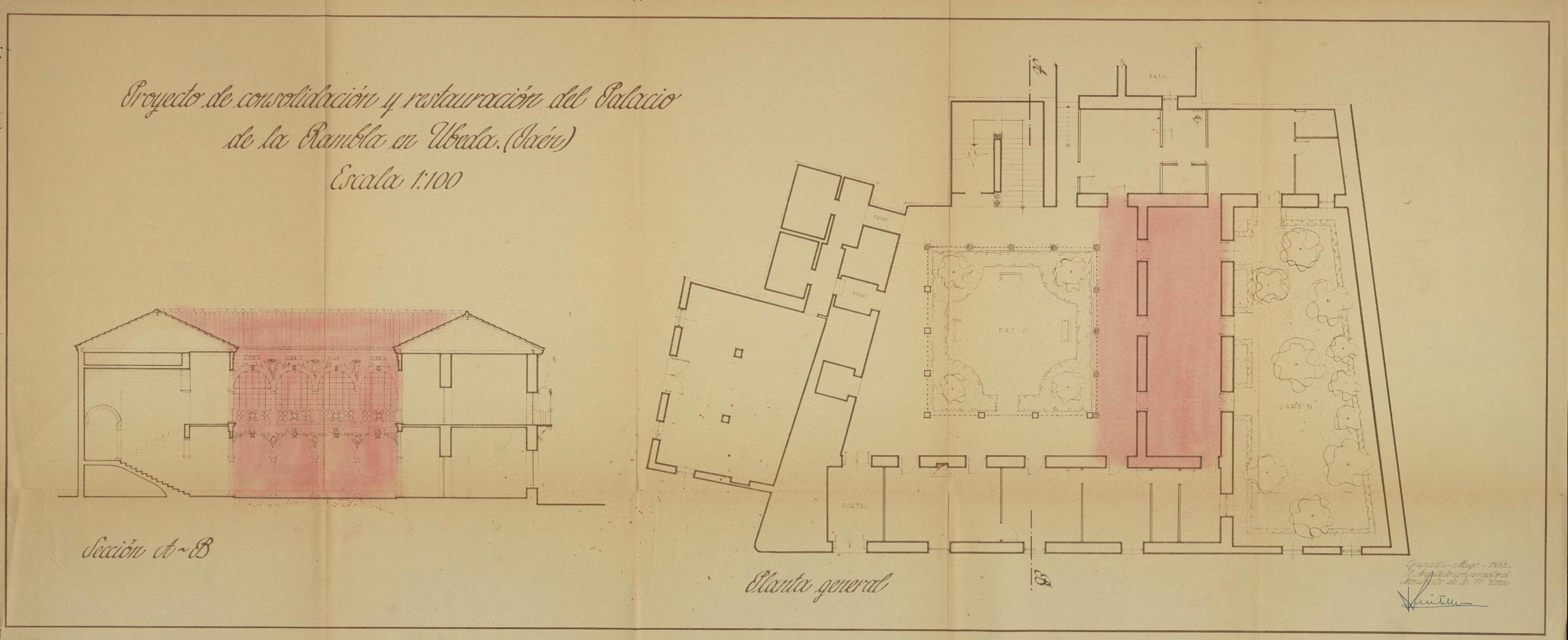 Palacio de la Rambla: Proyecto de restauración y conservación del Palacio de la Rambla, en Úbeda Actuación en el Patio, segunda fase Planta general y sección A-B