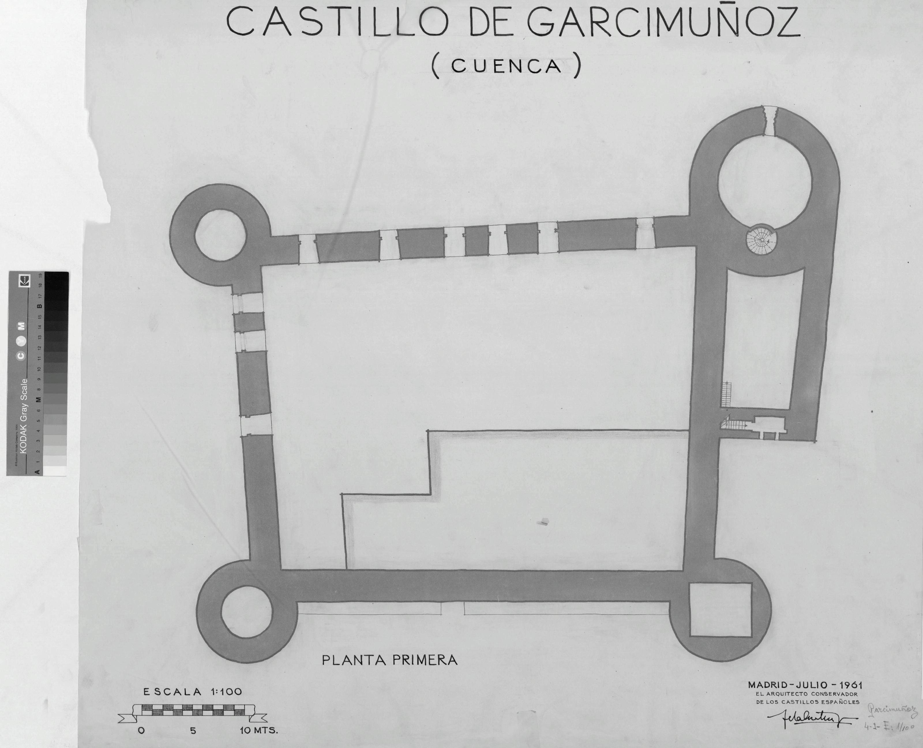 CASTILLO DE GARCIMUÑOZ - CUENCA -: PLANTA PRIMERA. Planta primera, muros regruesados y sombreados, con acceso de escalera , dibujo esquematico. Plano sin acotar.