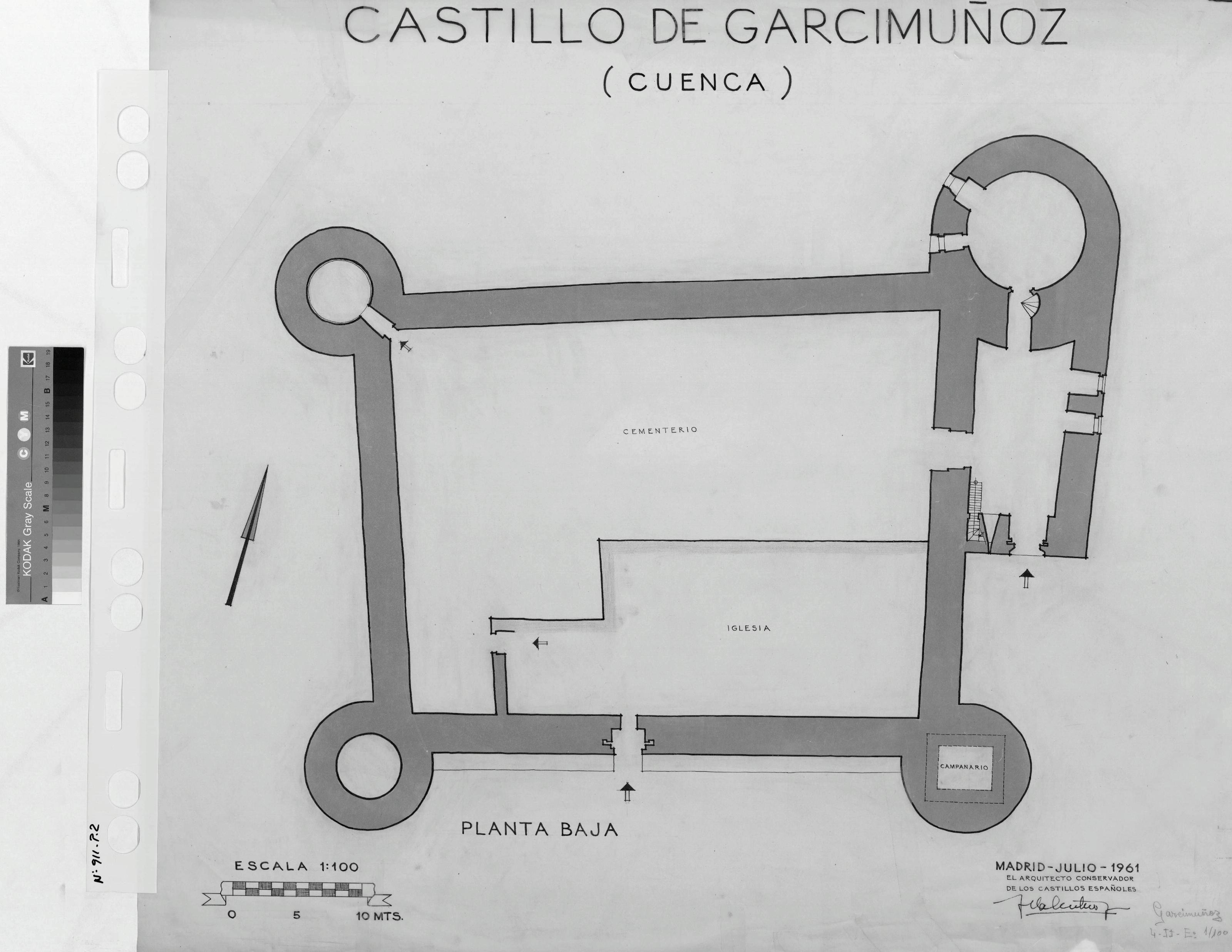 CASTILLO DE GARCIMUÑOZ - CUENCA -: PLANTA BAJA . Planta, muros regruesados y sombreados, nos marca dos zonas dentro del recinto del castillo una es el cementerio y otra la iglesia .tambien vemos señalado el campanario, dibujo esquematico. Plano sin acotar.