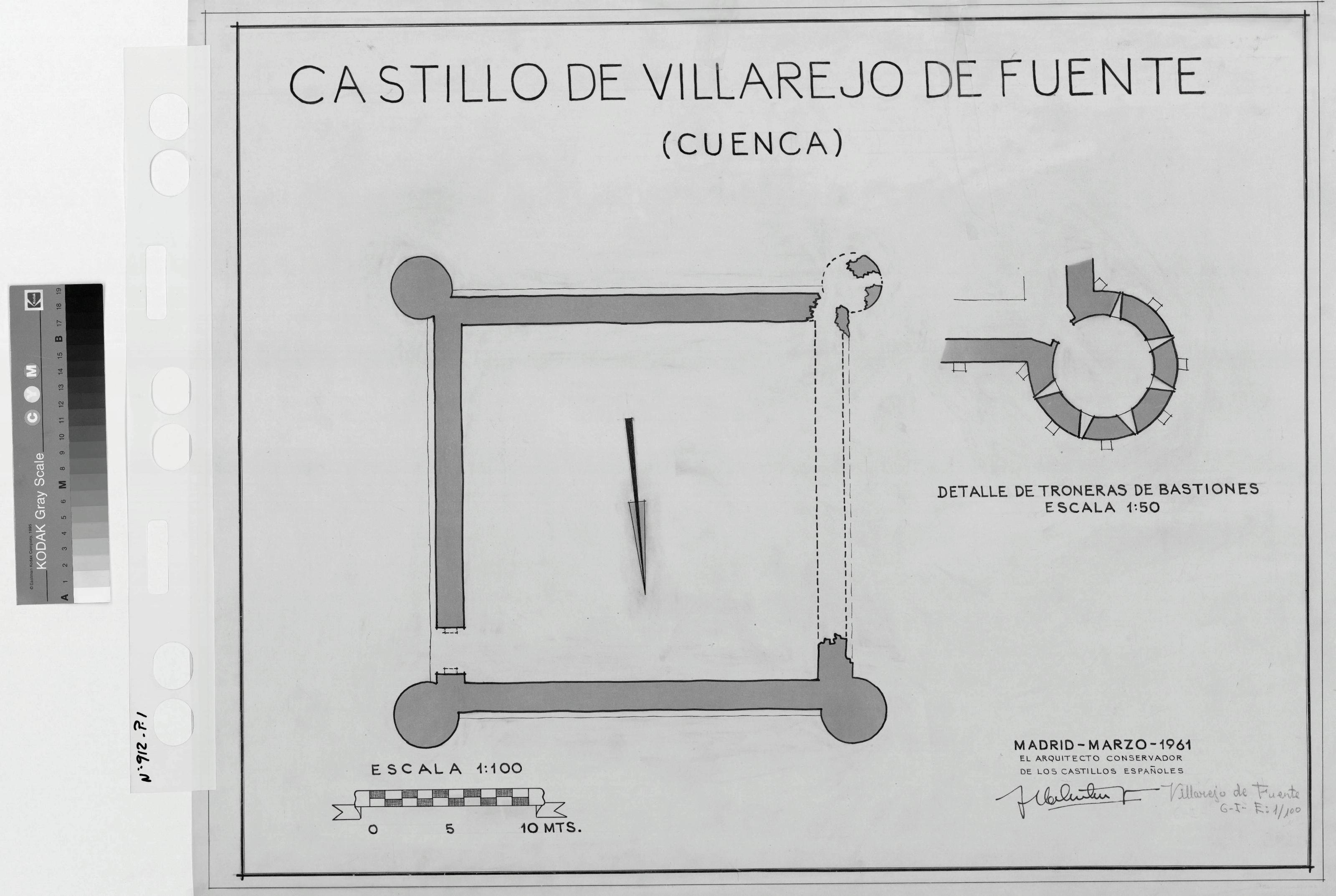 CASTILLO DE VILLAREJO DE FUENTE - CUENCA -: PLANTA GENERAL . Planta, muros regruesados y sombreados, nos marca una zona del muro deteriorada, y un detalle de las troneras de bastidores a escala 1:50, dibujo esquematico. Plano sin acotar.