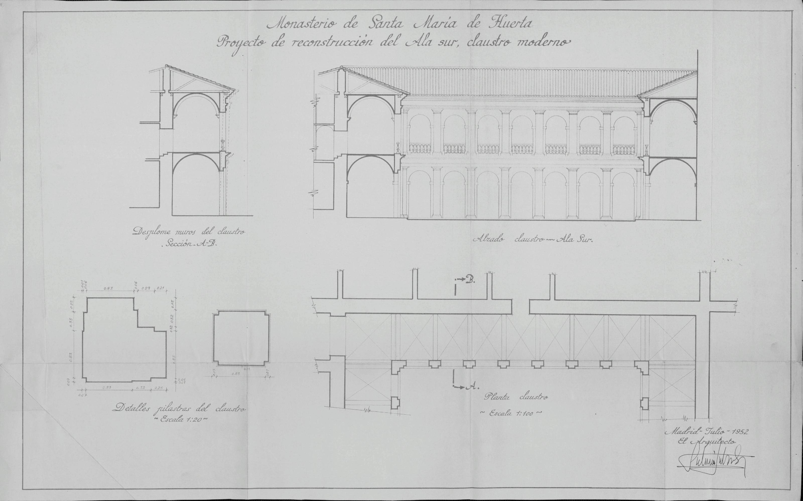 Monasterio Santa María de Huerta. Soria.: Proyecto de reconstrucción del Ala Sur, claustro moderno. Planta, alzado, sección A-B y detalles de pilastras del claustro.