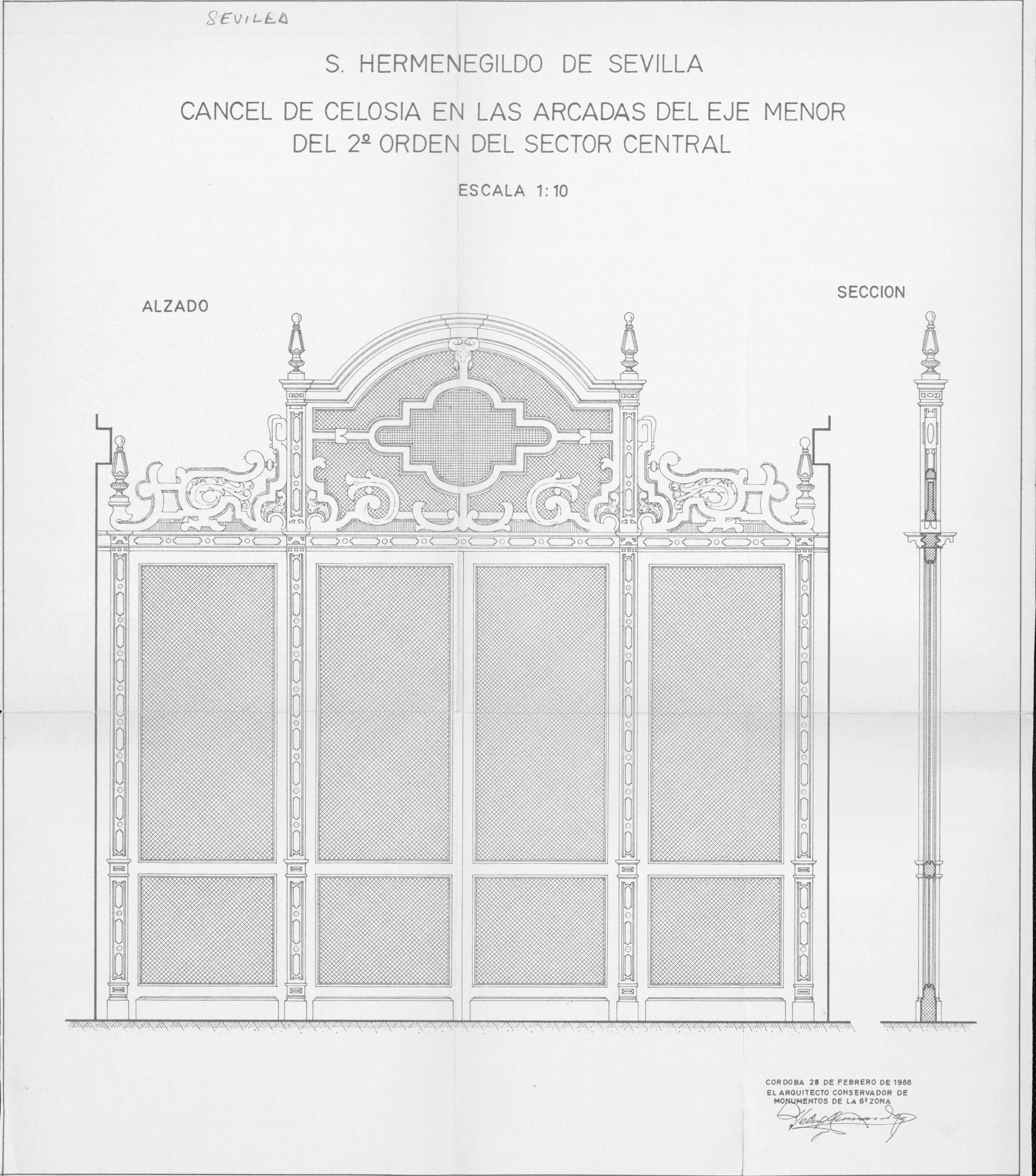 Iglesia del Colegio de San Hermenegildo: Iglesia del Colegio de San Hermenegildo Cancela de celosía en las arcadas del eje menor del segundo orden del sector central Alzado y seccion