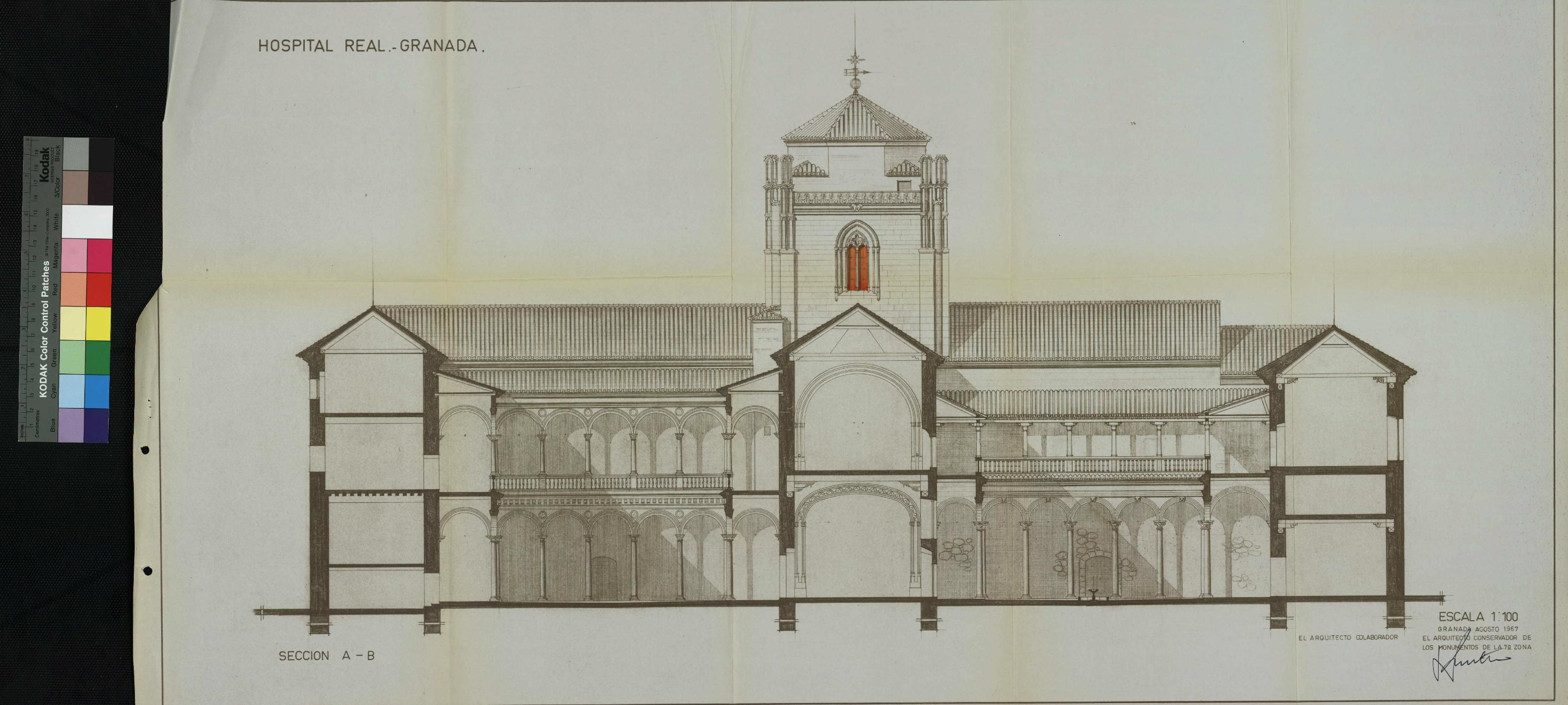 Hospital Real de Granada: Hospital Real Sección A-B - Situación de la vidriera Vidriera plomada en el crucero de la planta alta