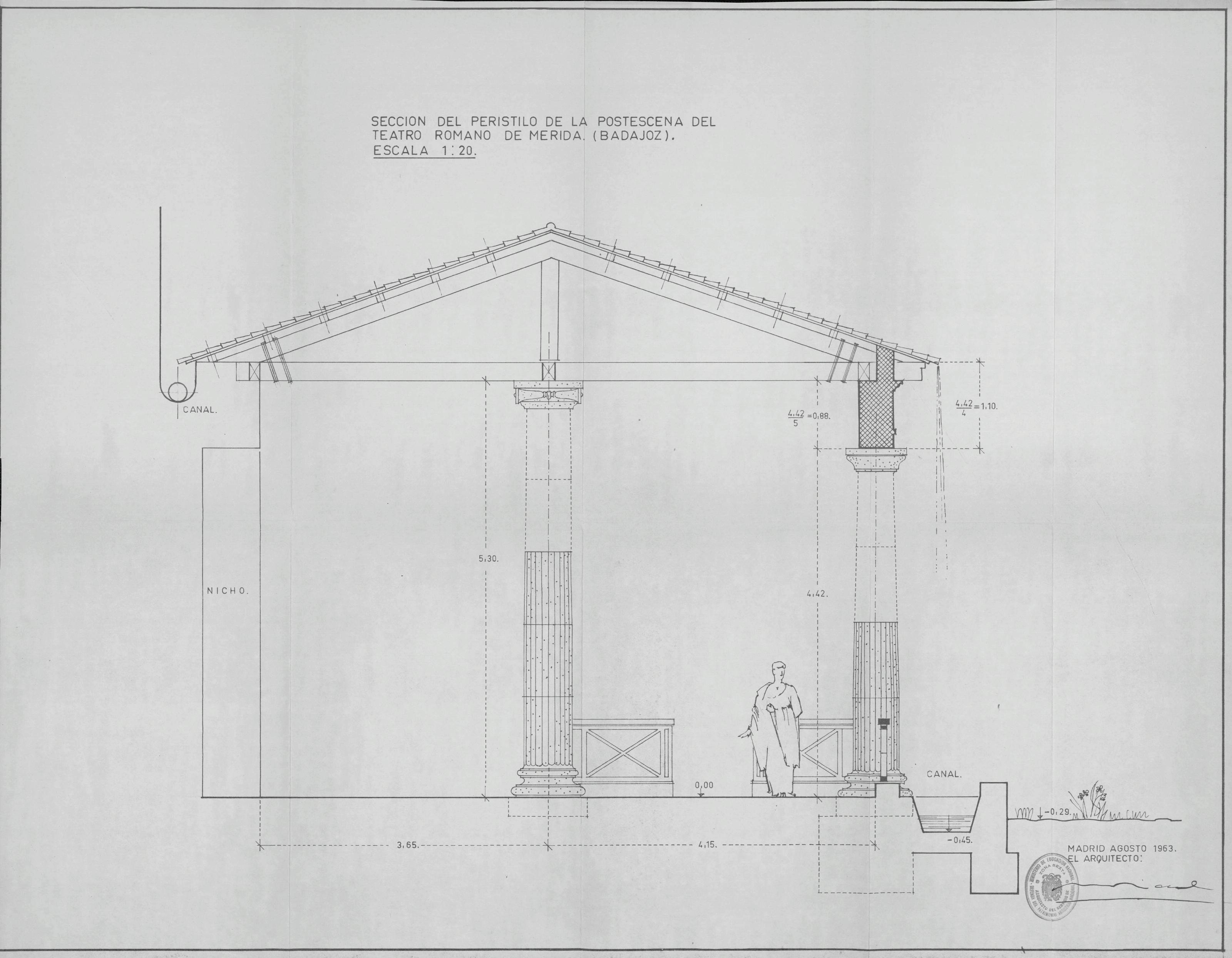 TEATRO ROMANO. MÉRIDA.: SECCIÓN DEL PERISTILO DE LA POSTESCENA DEL TEATRO ROMANO.