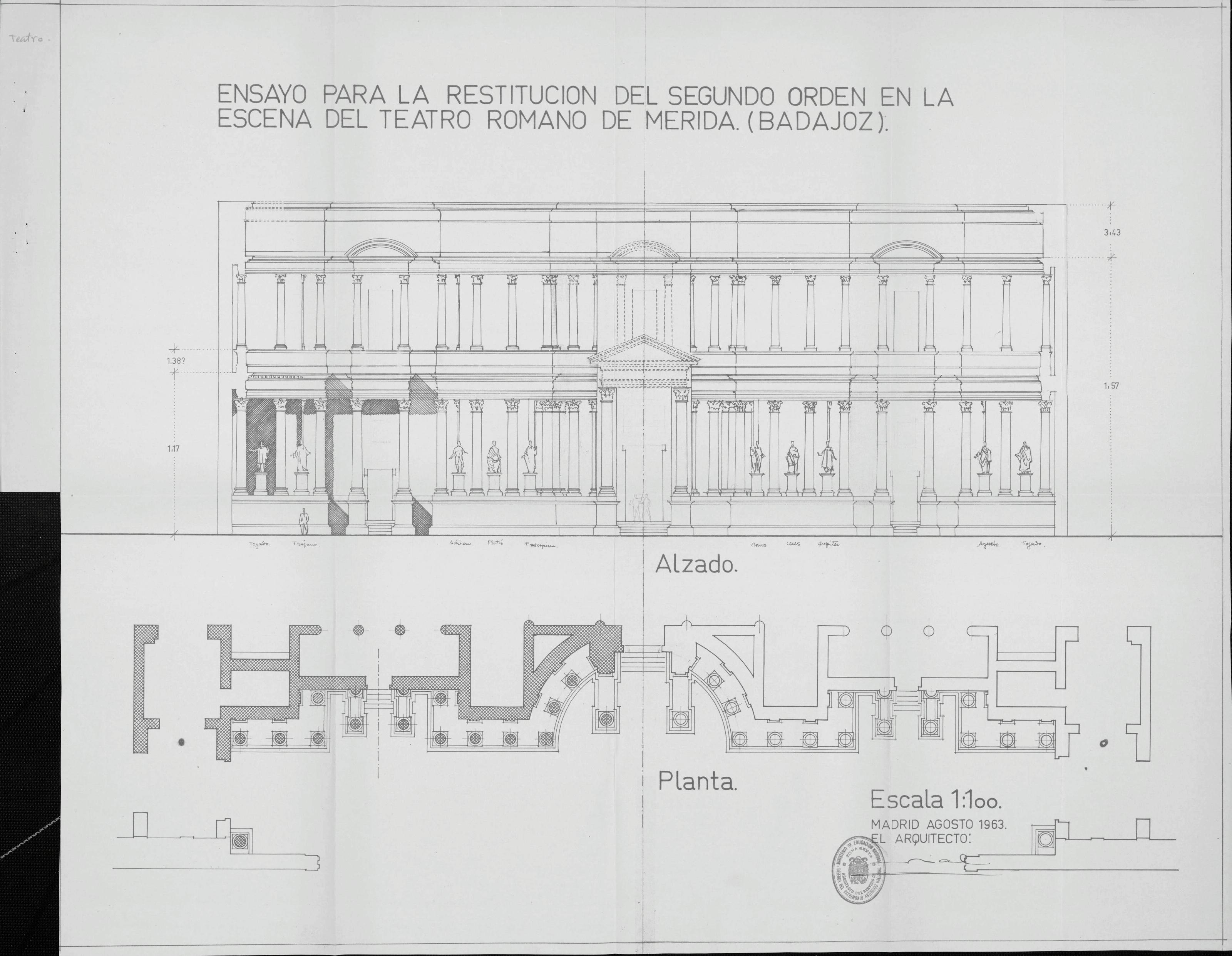 TEATRO ROMANO. MÉRIDA.: ENSAYO DE LA RESTITUCIÓN DEL SEGUNDO ORDEN EN LA ESCENA DEL TEATRO ROMANO.