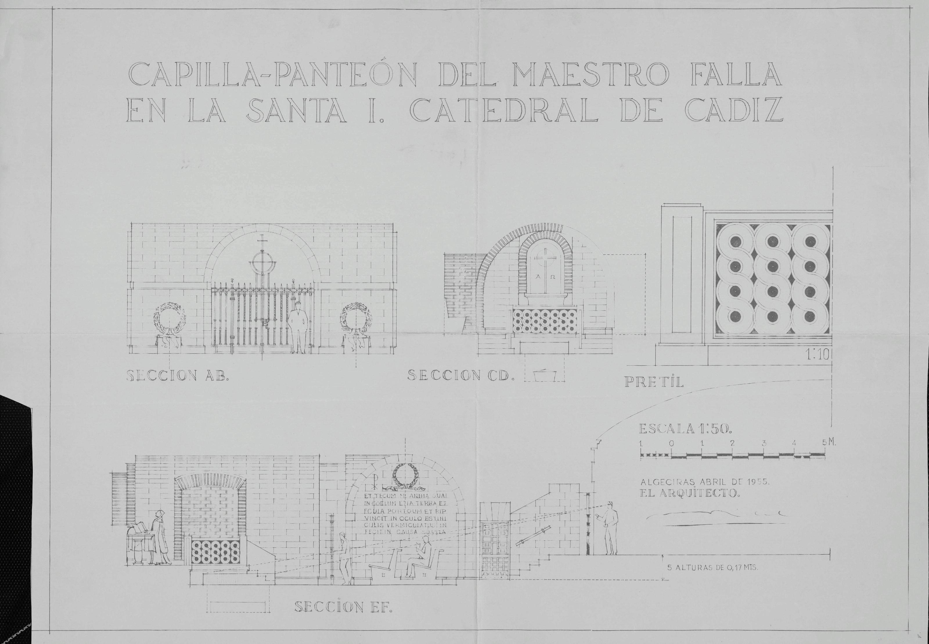 Catedral de Cádiz: Capilla-panteón del Maestro Falla en la Santa I. Catedral de Cádiz. Secciones longitudinal y transversales. Plano de detalle del pretil.