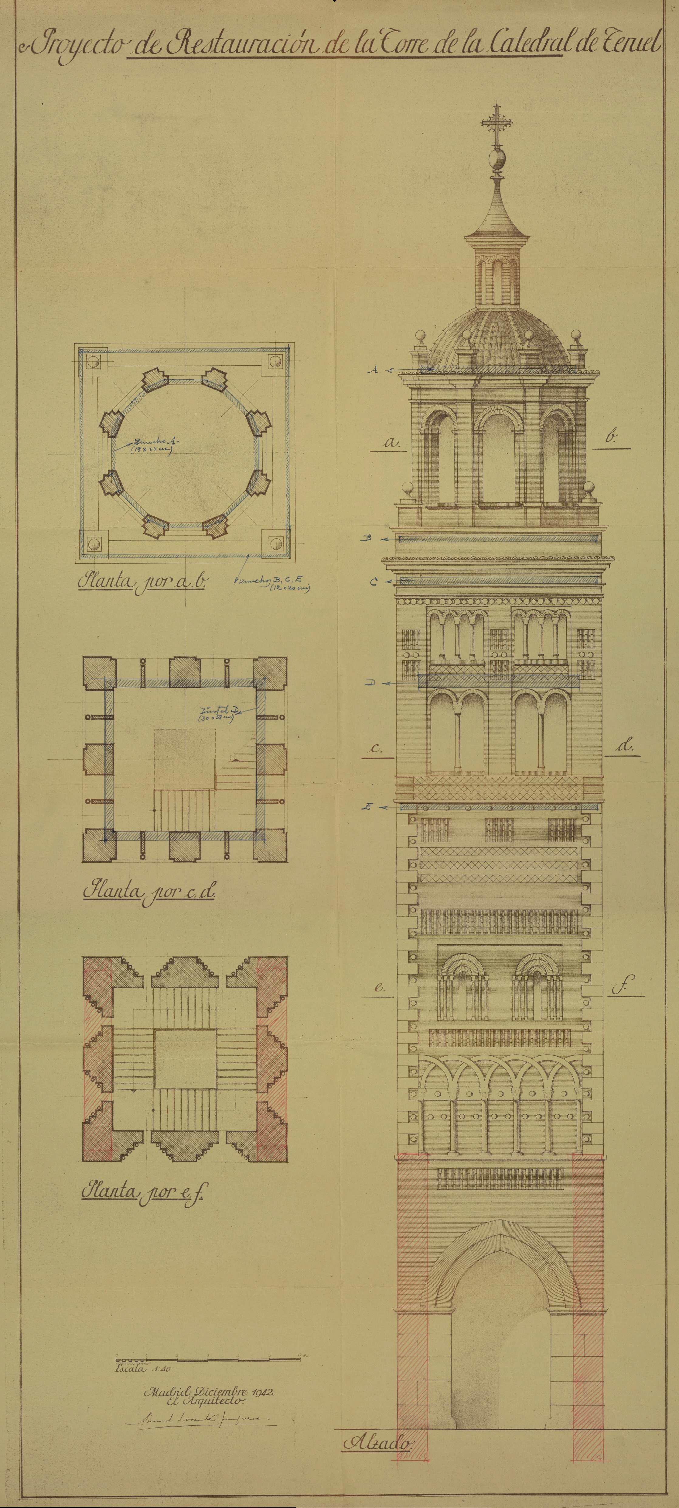 Proyecto de Restauración de la Catedral de Teruel: Alzado Planta por A-B Planta por C-D Planta por E-F
