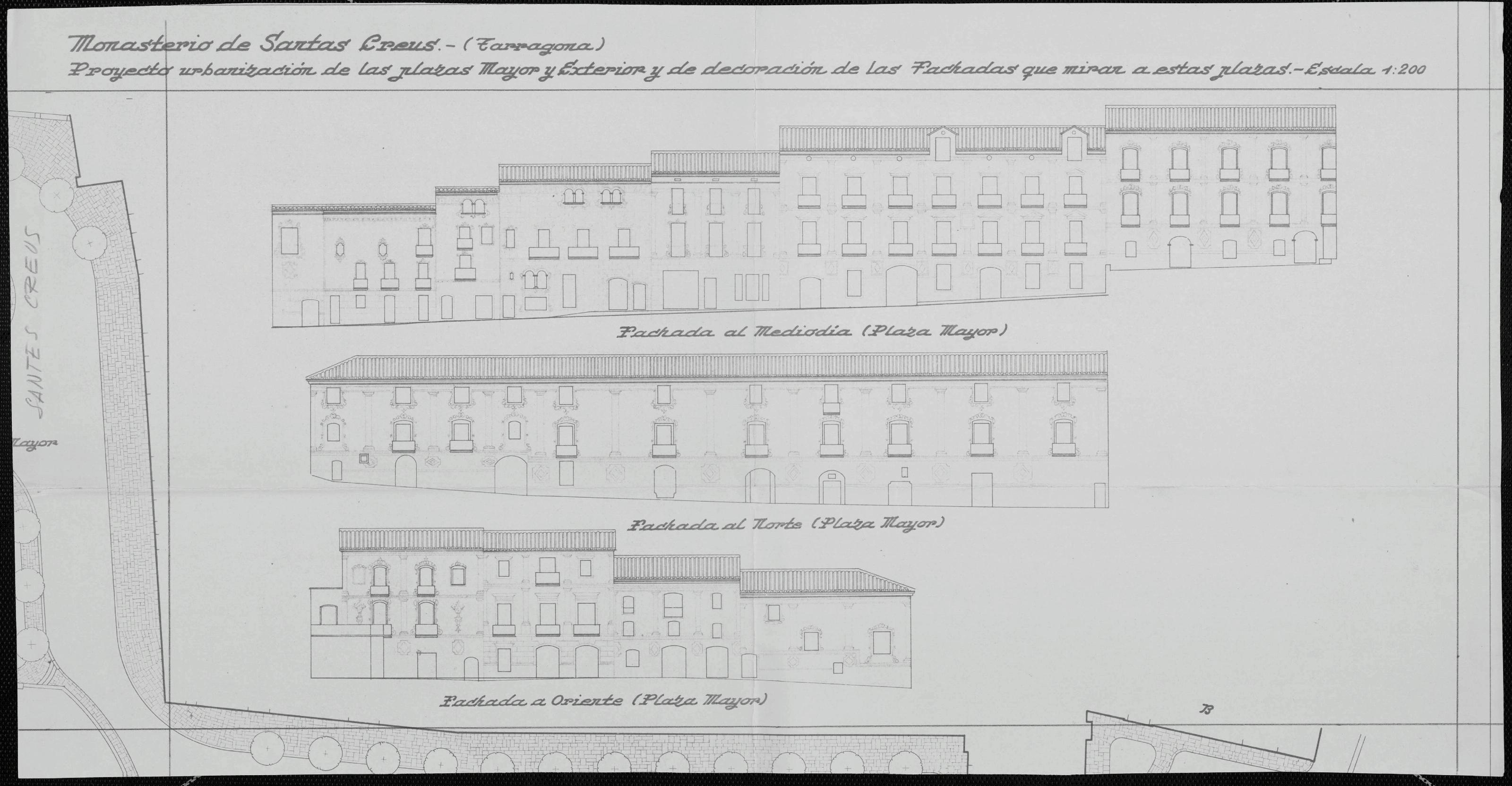 MONASTERIO DE SANTAS CREUS: UBANIZACION DE LAS PLAZAS MAYOR Y EXTERIOR Y DECORACION DE LAS FACHADAS QUE MIRAN A ESTAS PLAZAS,: FACHADA AL MEDIODIA (PLAZA MAYOR) , FACHADA AL NORTE (PLAZA MAYOR) Y FACHADA A ORIENTE (PLAZA MAYOR)
