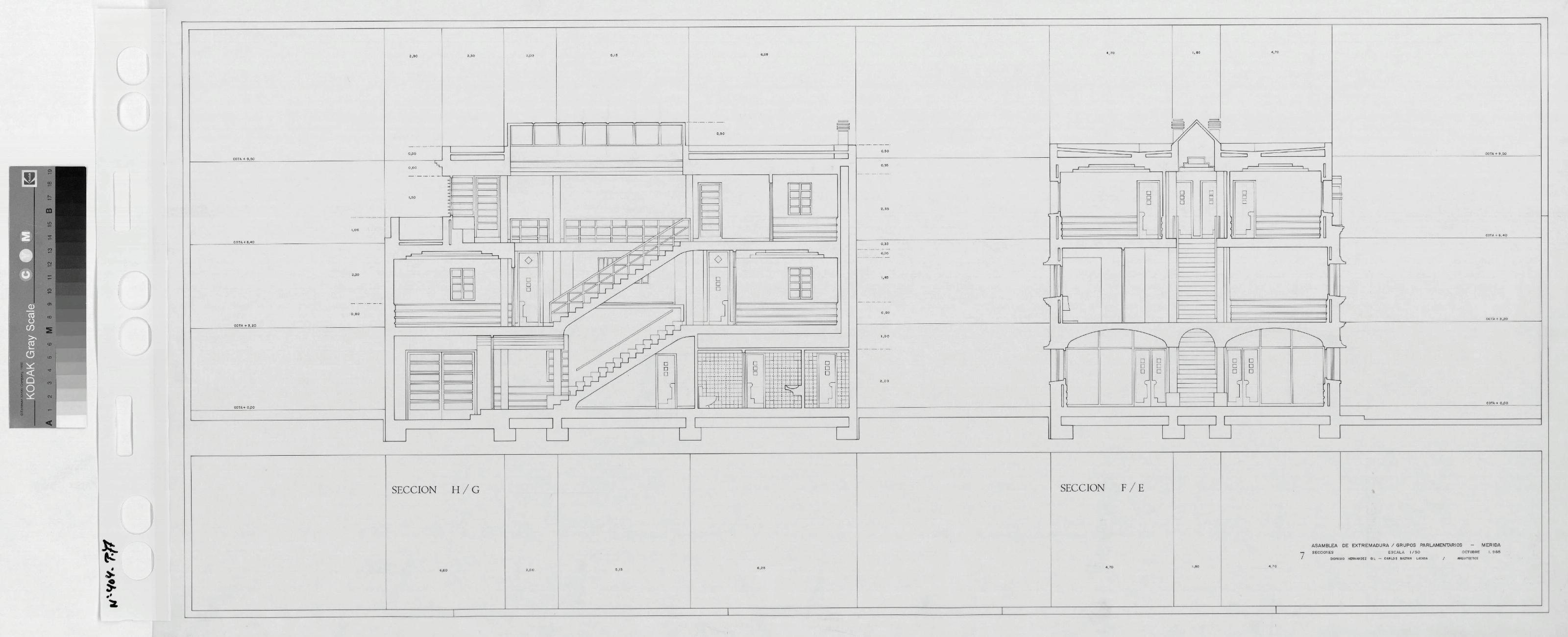 ASAMBLEA DE EXTREMADURA PROYECTO DE REHABILITACIÓN DEL ANTIGUO HOSPITAL DE S. JUAN DE DIOS PARA SEDE DE LA ASAMBLEA: SECCIONES "H-G y F-E" Pone en sello " Asamblea de Extremadura - Grupos Parlamentarios" Con cotas. Sin firmar