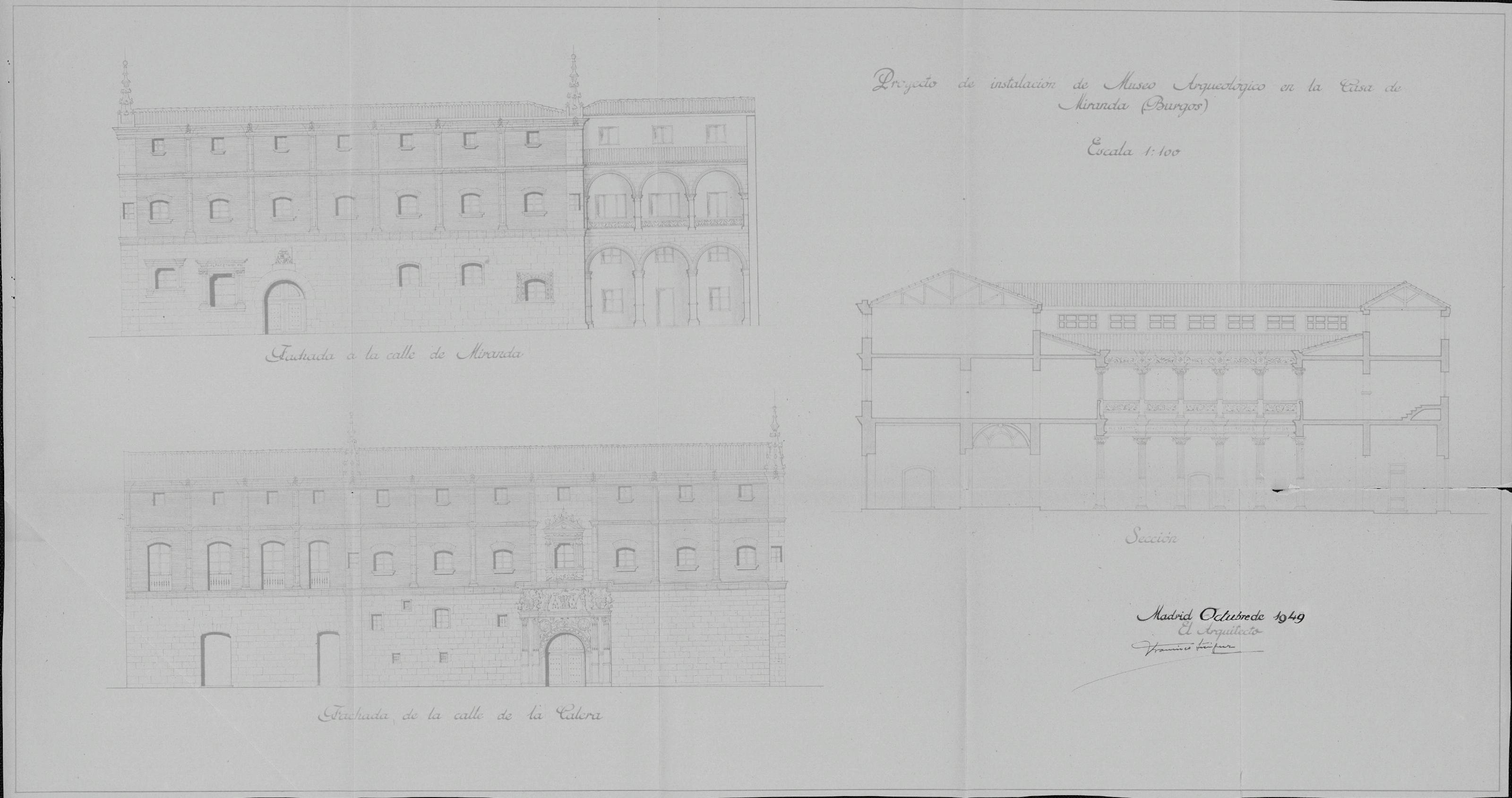 Casa Miranda de Burgos (Museo de Burgos). Burgos.: Proyecto de instalación del Museo Arqueológico Provincial. Alzados de fachada a la calle Miranda, a la calle de la Calera y sección por patio.