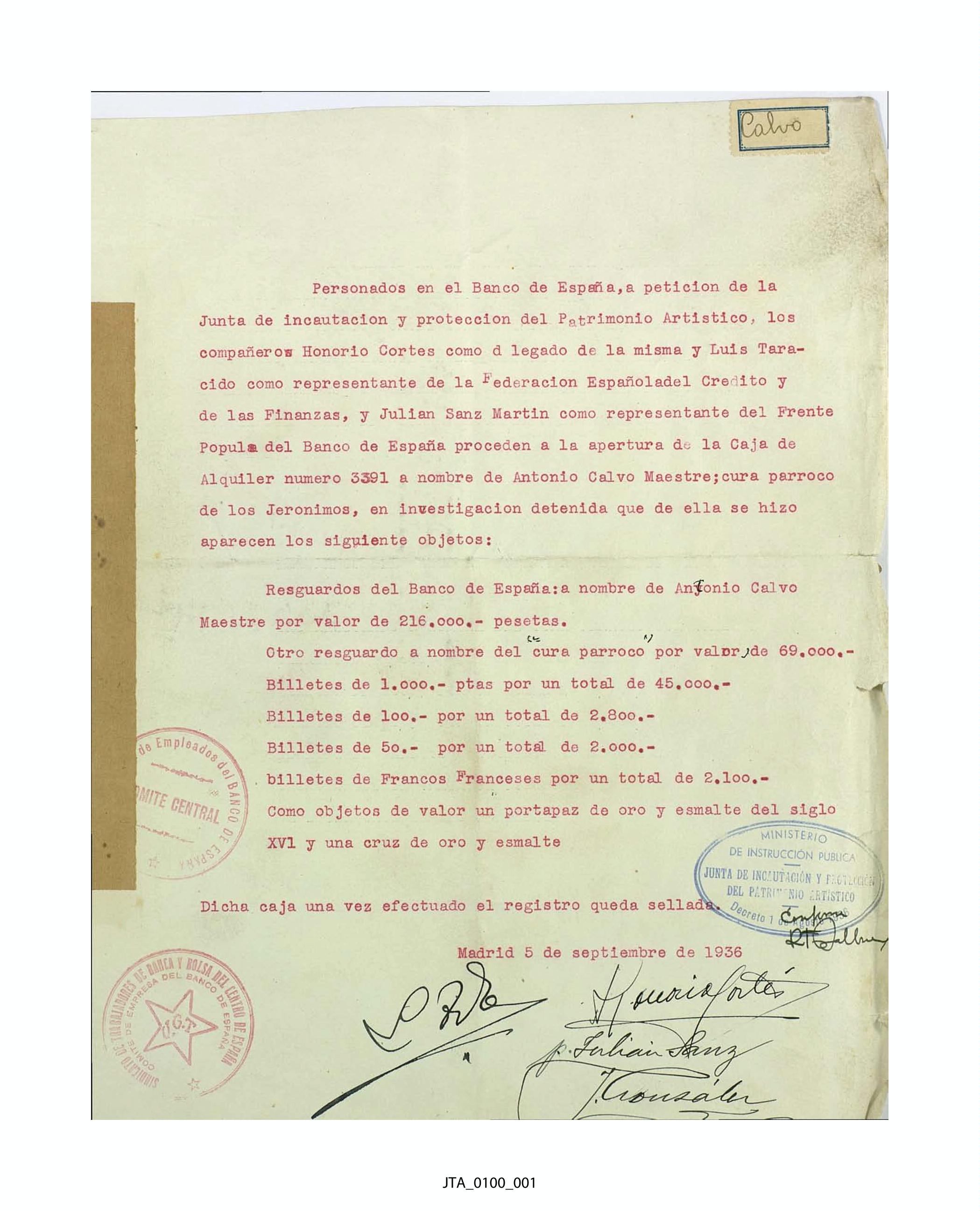Acta de incautación de Antonio Calvo Maestre (Iglesia de Los Jerónimos)