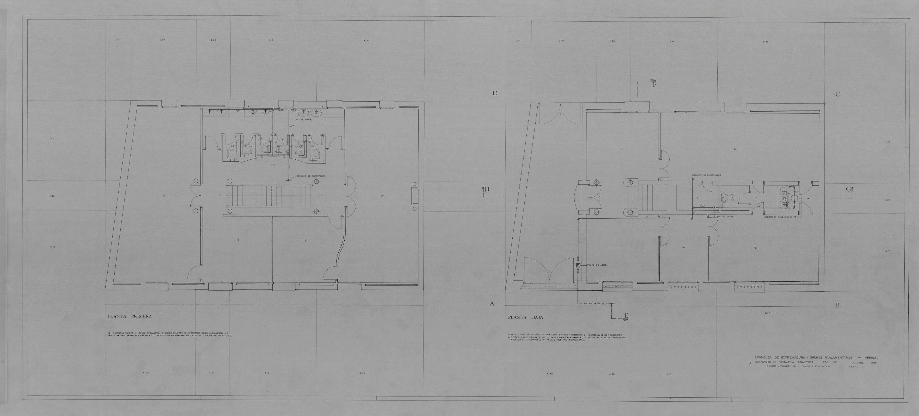 ASAMBLEA DE EXTREMADURA PROYECTO DE REHABILITACIÓN DEL ANTIGUO HOSPITAL DE S. JUAN DE DIOS PARA SEDE DE LA ASAMBLEA: PLANTAS BAJA Y PRIMERA INSTALACIÓN FONTANERÍA - ACOMETIDAS Pone en sello " Asamblea de Extremadura - Grupos Parlamentarios" Con medidas y leyenda. Con cotas y denominación de usos . Sin firmar