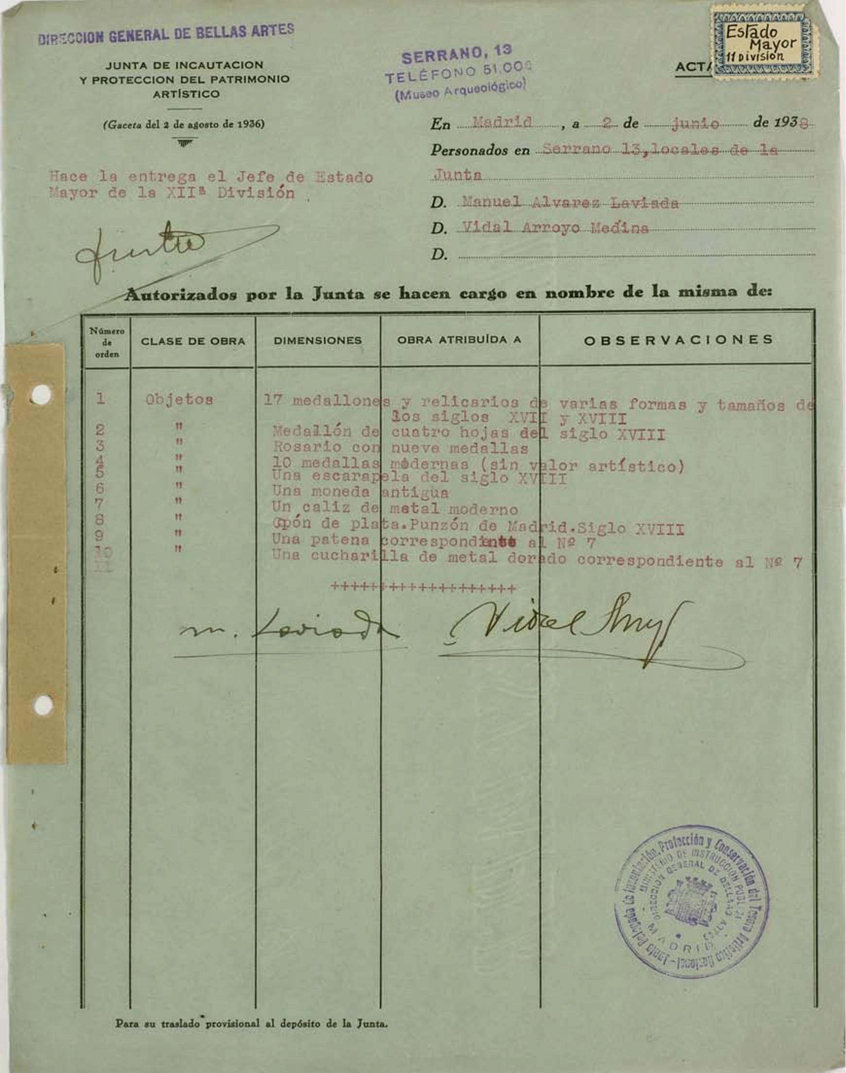 Acta de incautación del Estado Mayor 11 División