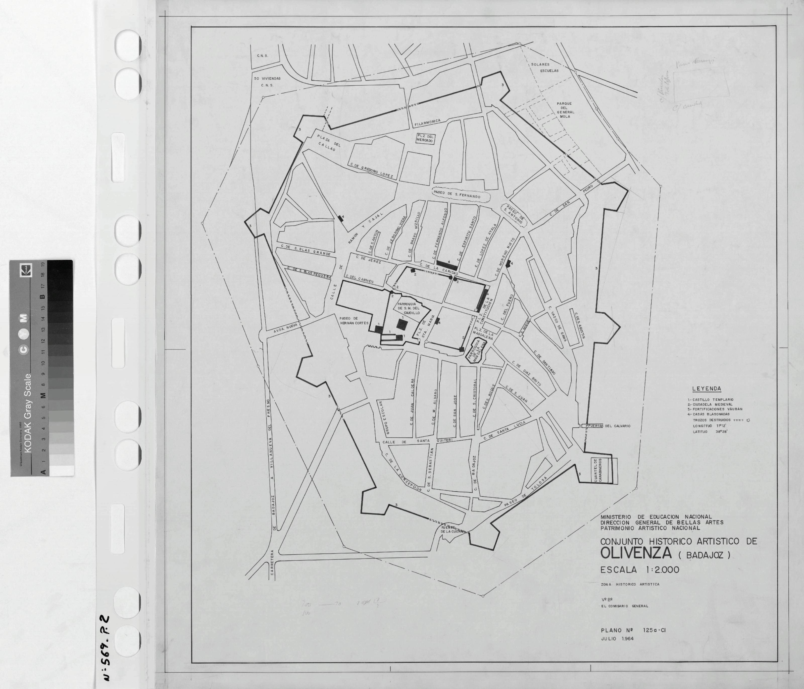 CONJUNTO HISTORICO ARTISTICO DE OLIVENZA (Badajoz): PLANTA GENERAL DEL RECINTO - Zona histórico Artística Con accesos y nomenclatura de calles así como representación con leyenda de los trozos destruidos en los principales monumentos. Usos en solares adyacentes. Sin firmar