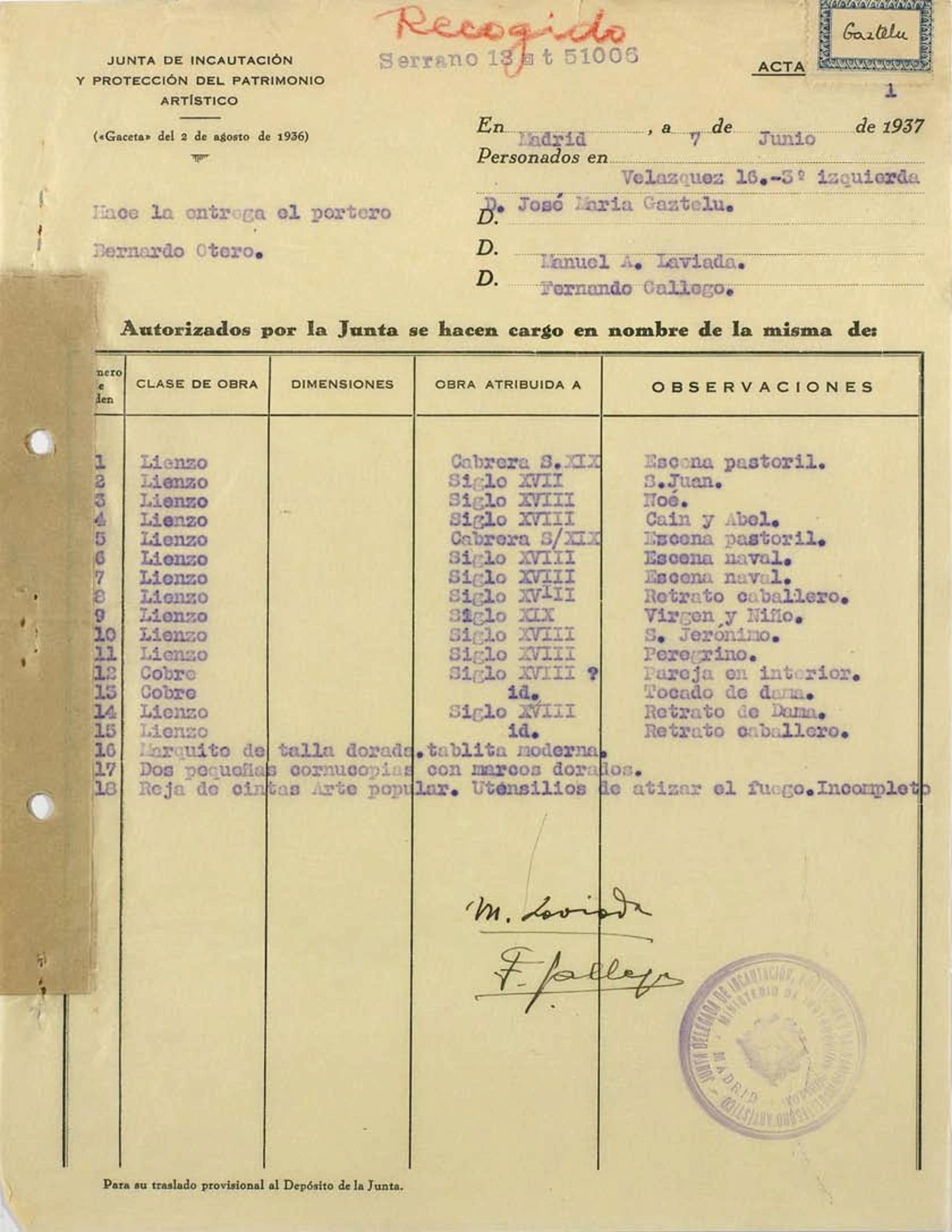 Acta de incautación de José María Gaztelu
