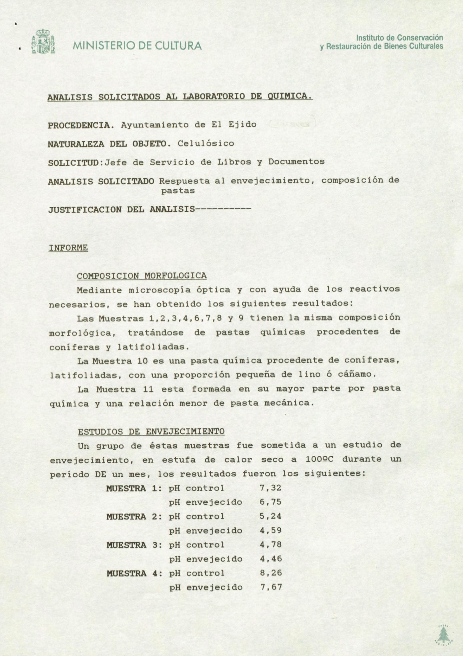 Informe sobre análisis químico de muestras de papel procedentes del Ayuntamiento de El Ejido (Almería)