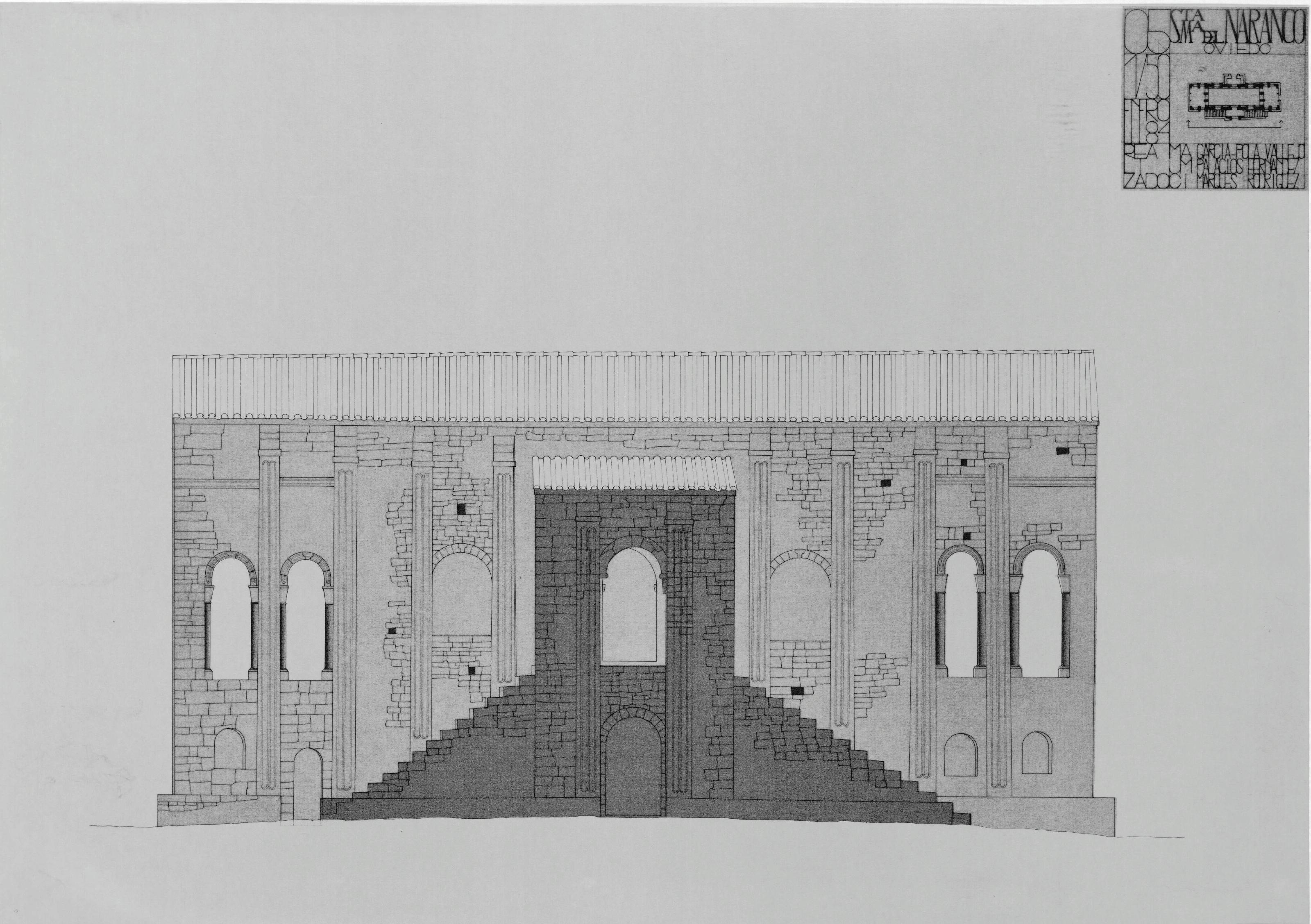 SANTA MARIA DEL NARANCO: ALZADO PRINCIPAL CON MUROS TRAMADOS SIN COTAS. PLANOS REALIZADOS POR PERSONAL CONTRATADO POR EL INEM