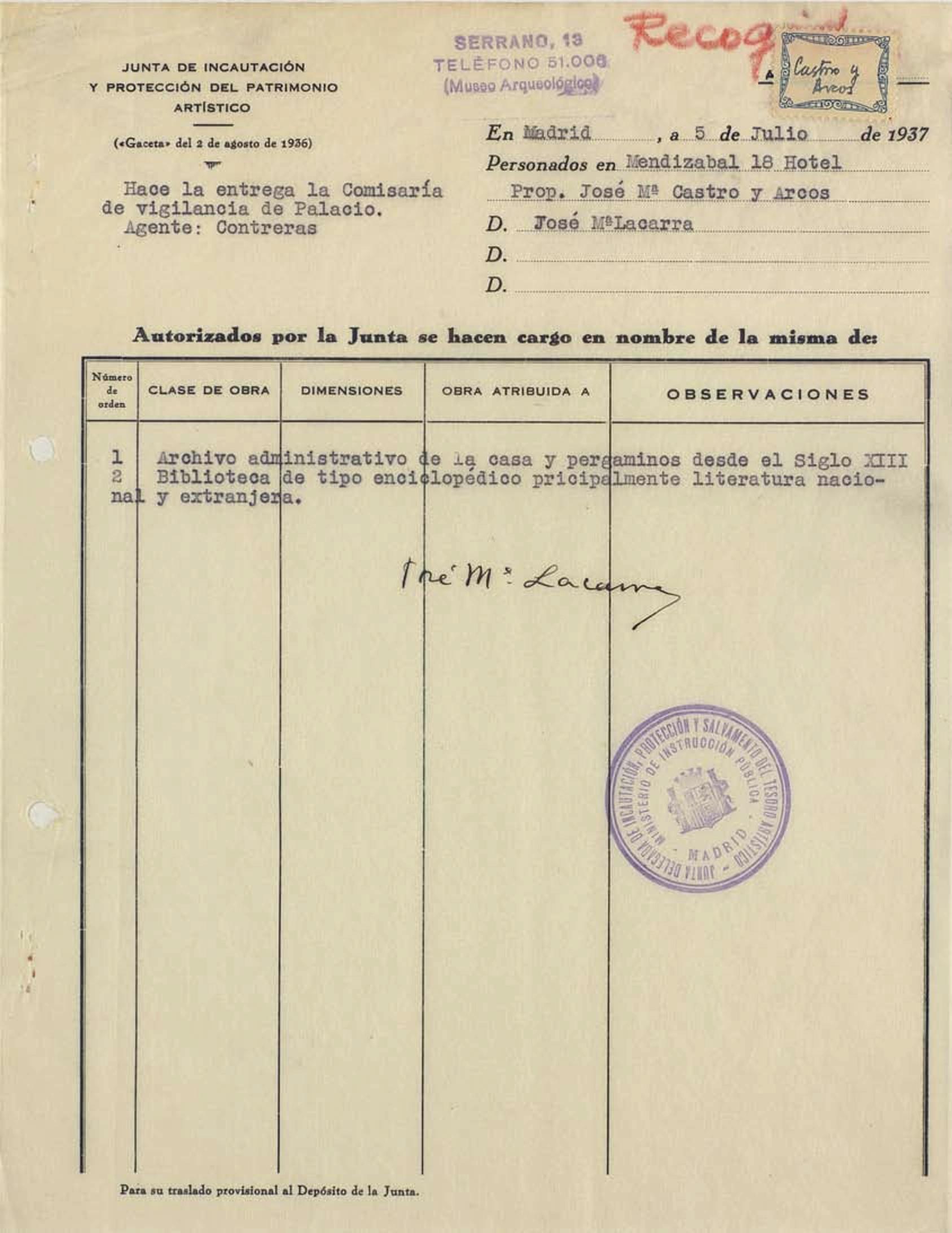 Acta de incautación de José María Castro y Arcos