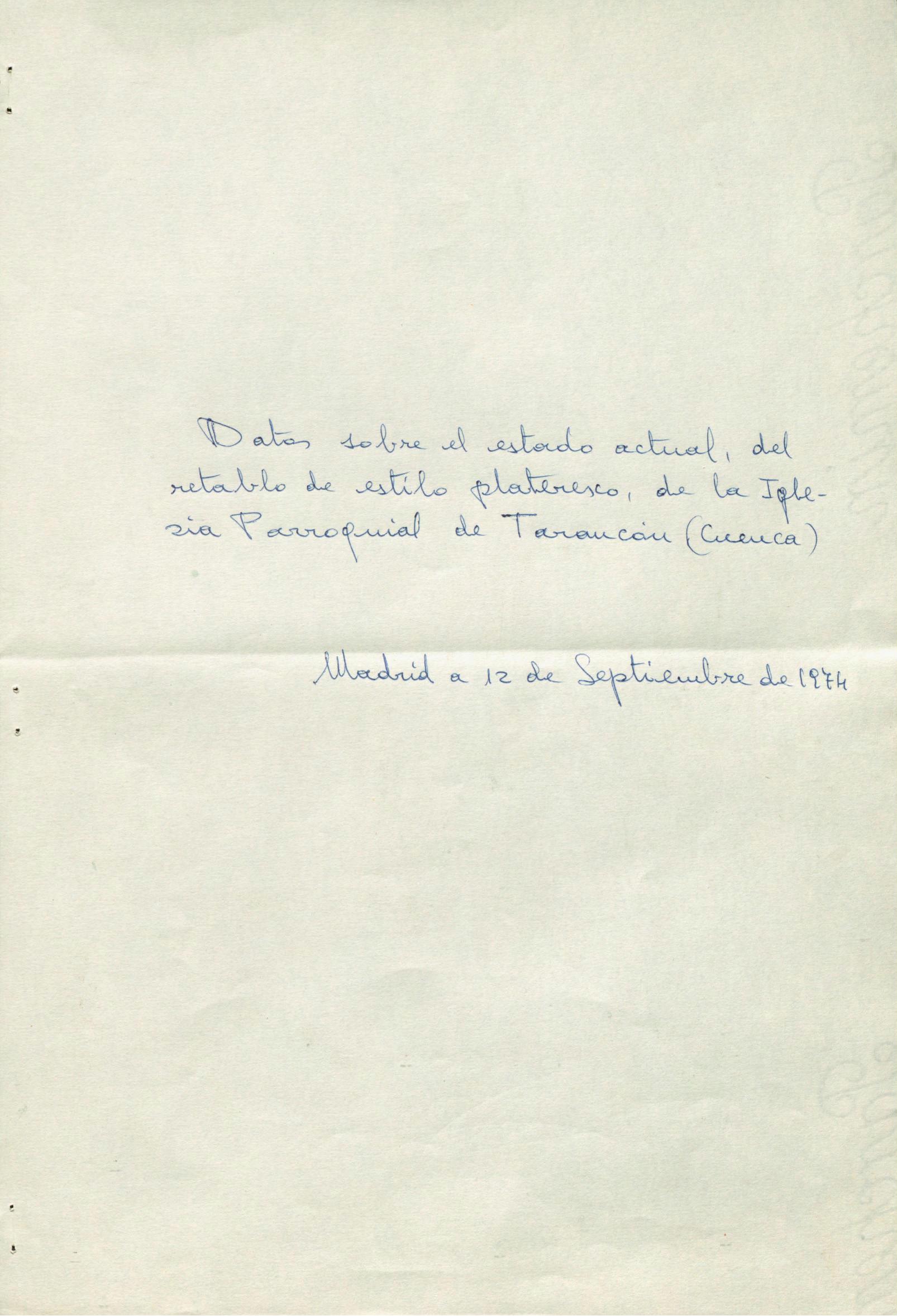 Informe de visita para la restauración de un retablo plateresco, procedente de la Iglesia parroquial de Taracón (Cuenca)