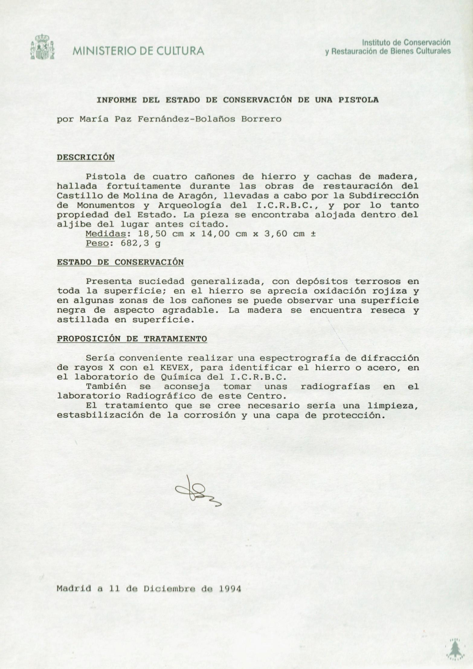 Informe de conservación de una pistola de cuatro cañones procedente del castillo de Molina de Aragón (Guadalajara)