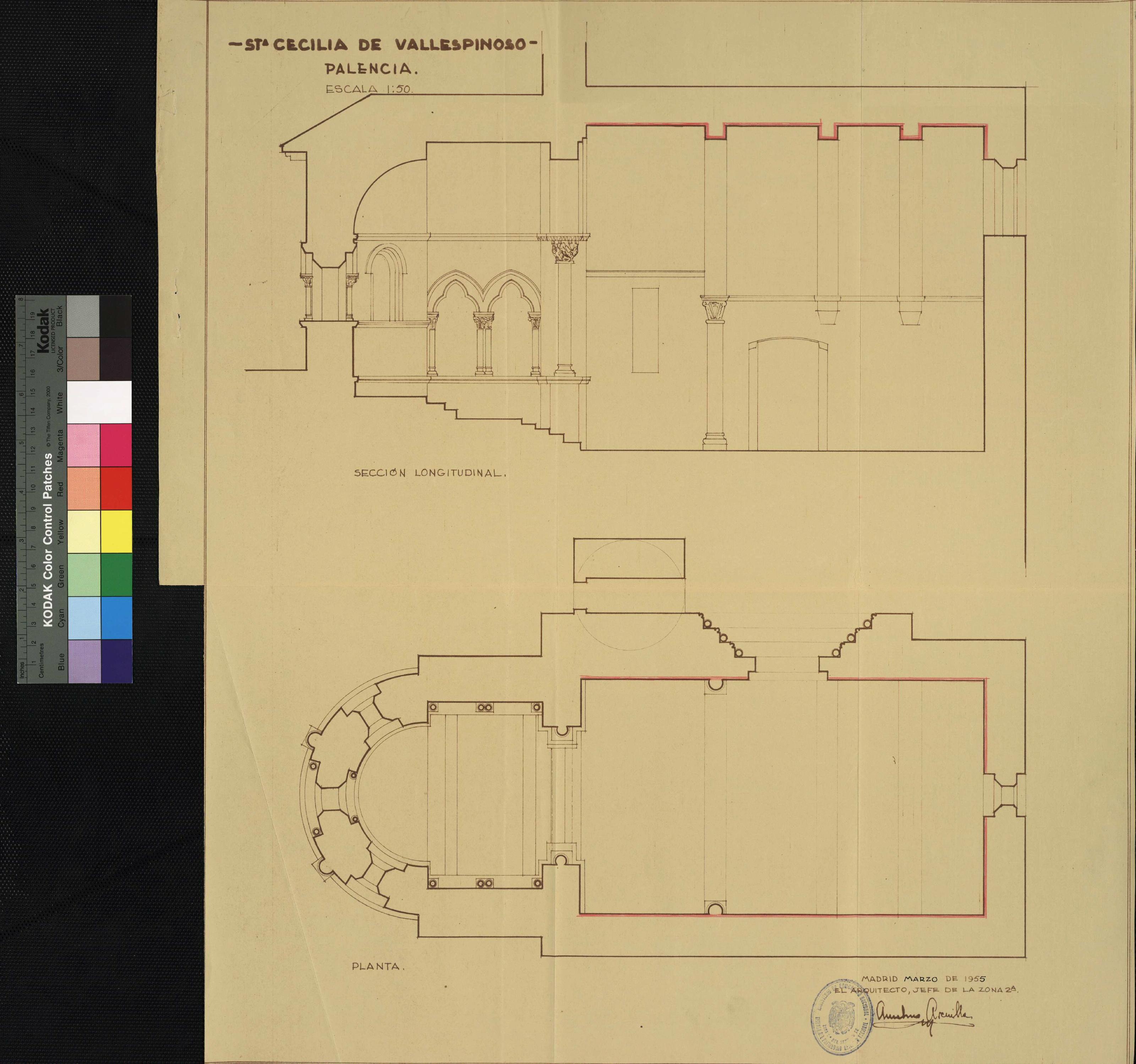 Iglesia de Santa Cecilia. Valle Espinosa de Aguilar. Aguilar de Campoo. Palencia.: Planta y sección longitudinal.
