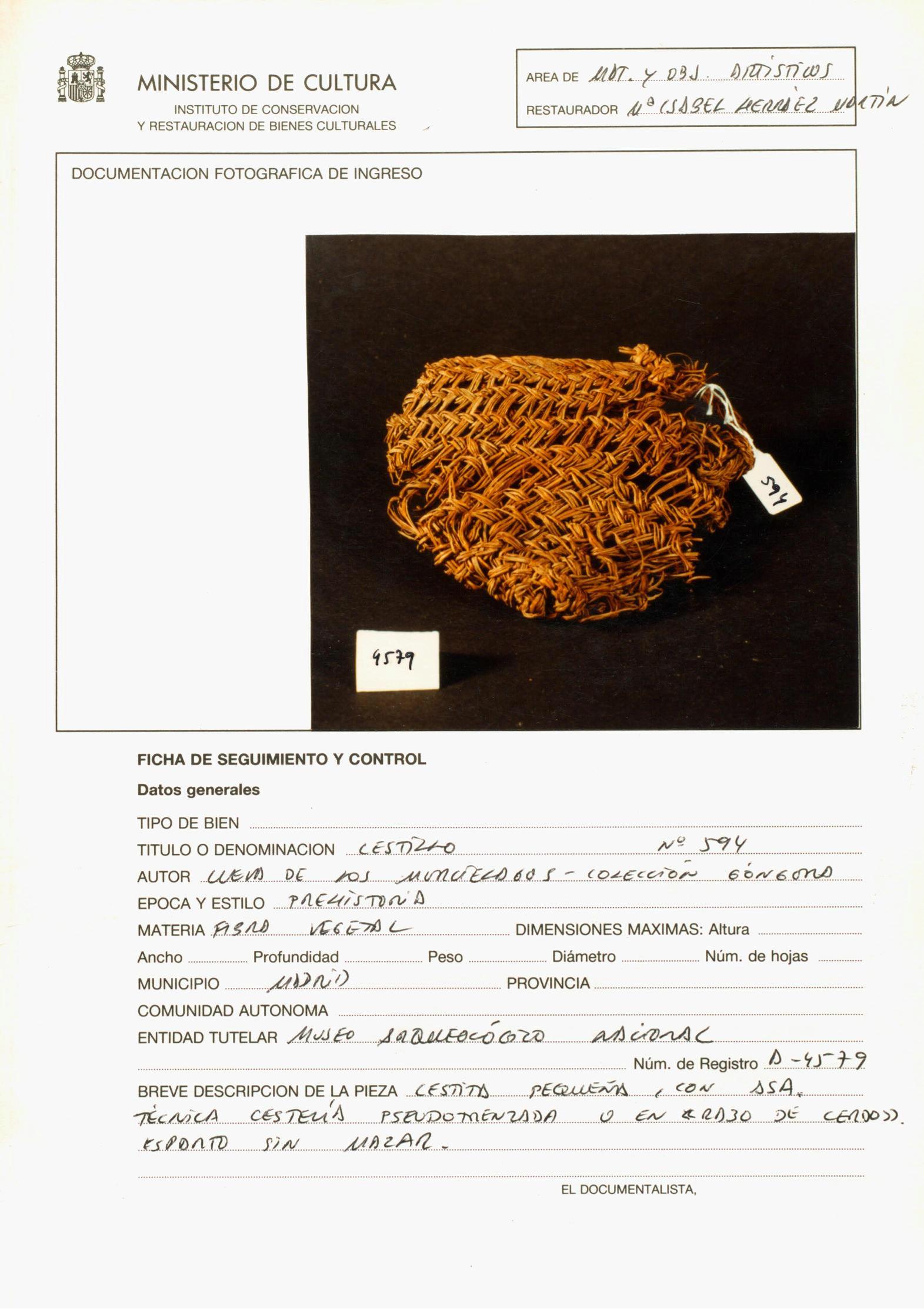 Restauración de un conjunto de esparto, compuesto por un cestillo y tres sandalias, hallados en la Cueva de los Murciélagos en Albuñol (Granada), y procedente del Museo Arqueológico Nacional (Madrid)
