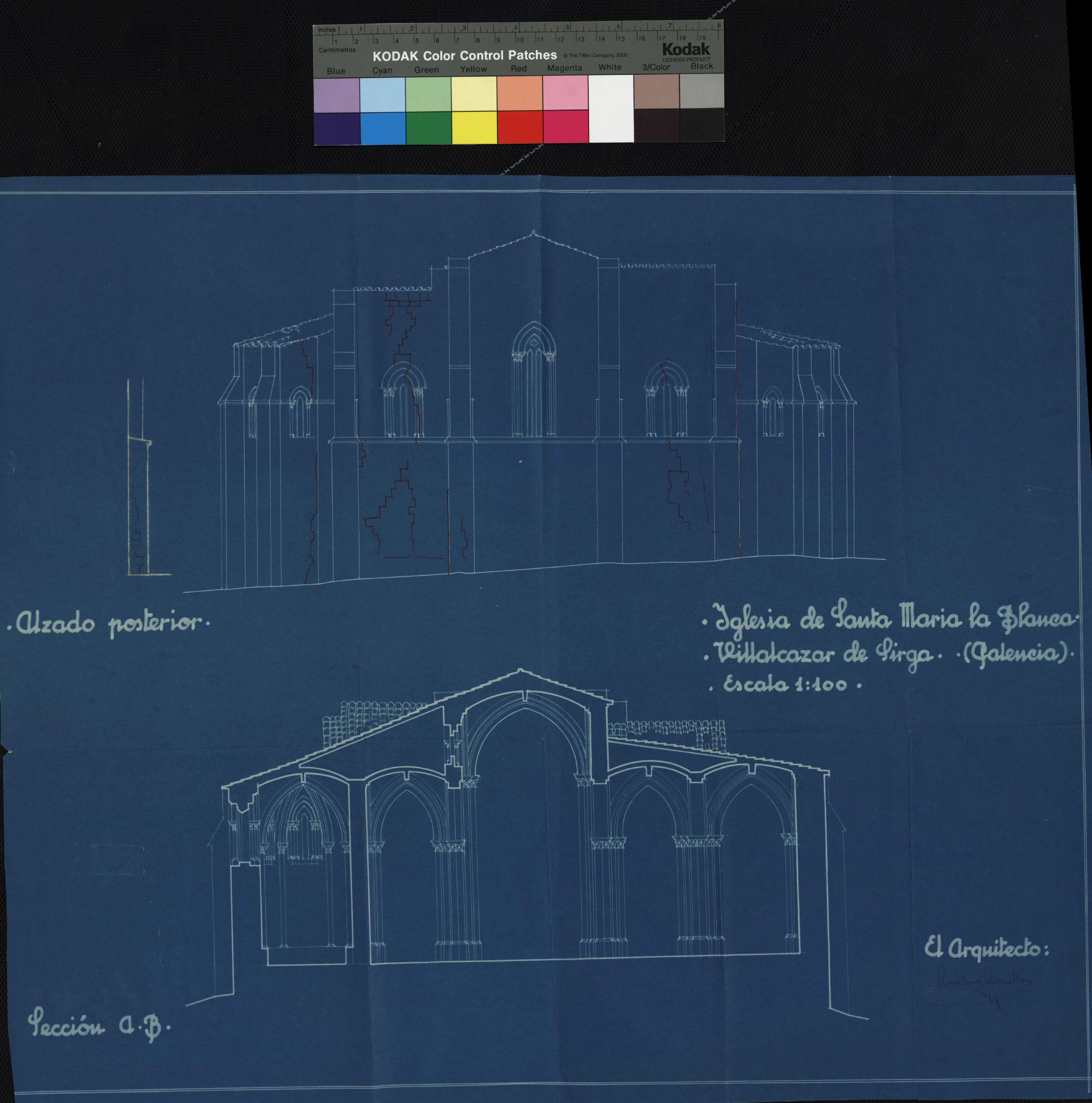 Iglesia Santa María la Blanca. Villalcázar de Sirga. Palencia.: Alzado posterior y sección A-B.