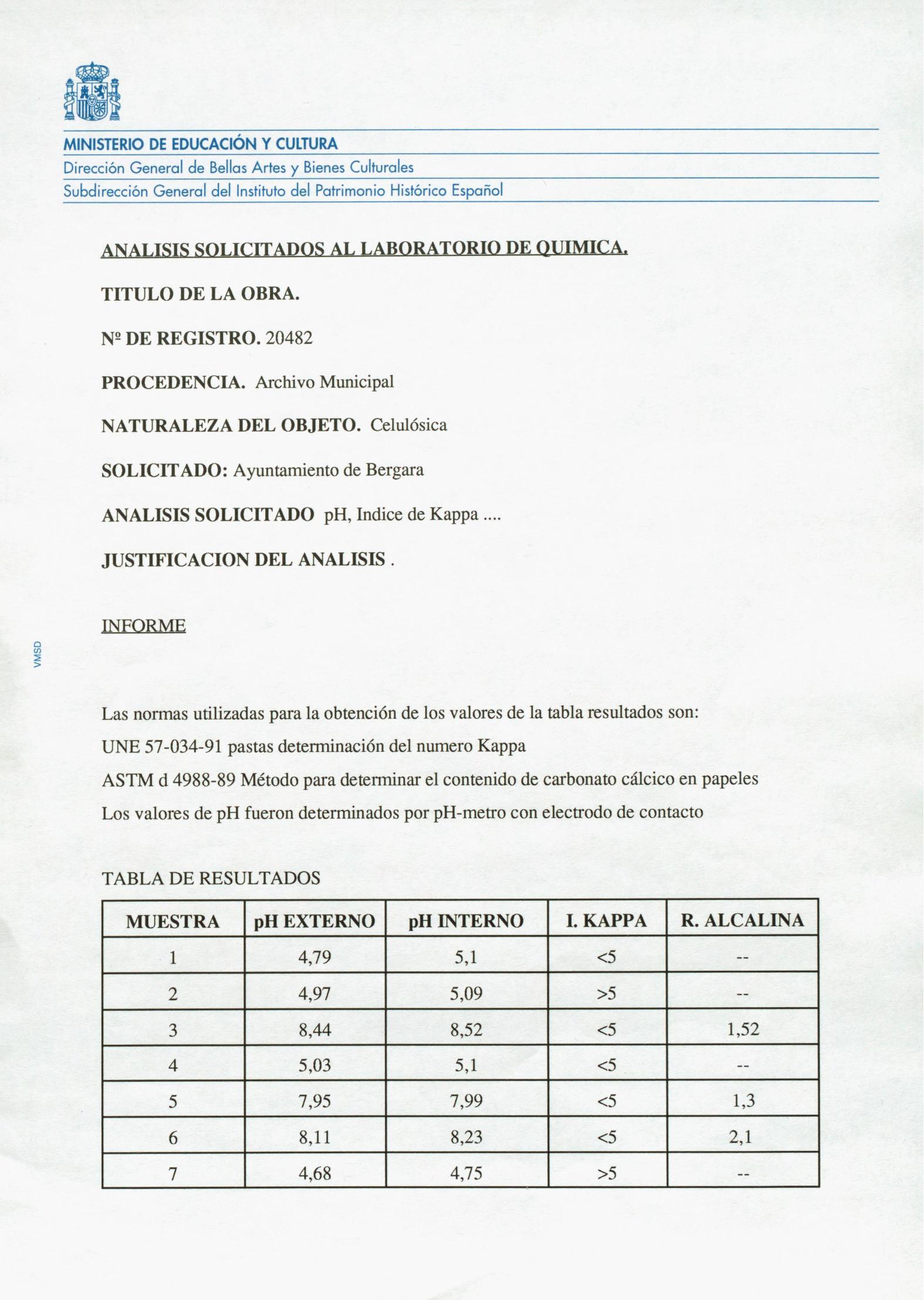 Informe de laboratorio sobre el análisis químico de varias muestras de celulosa, procedentes del Archivo Municipal de Bergara (Guipúzcoa)