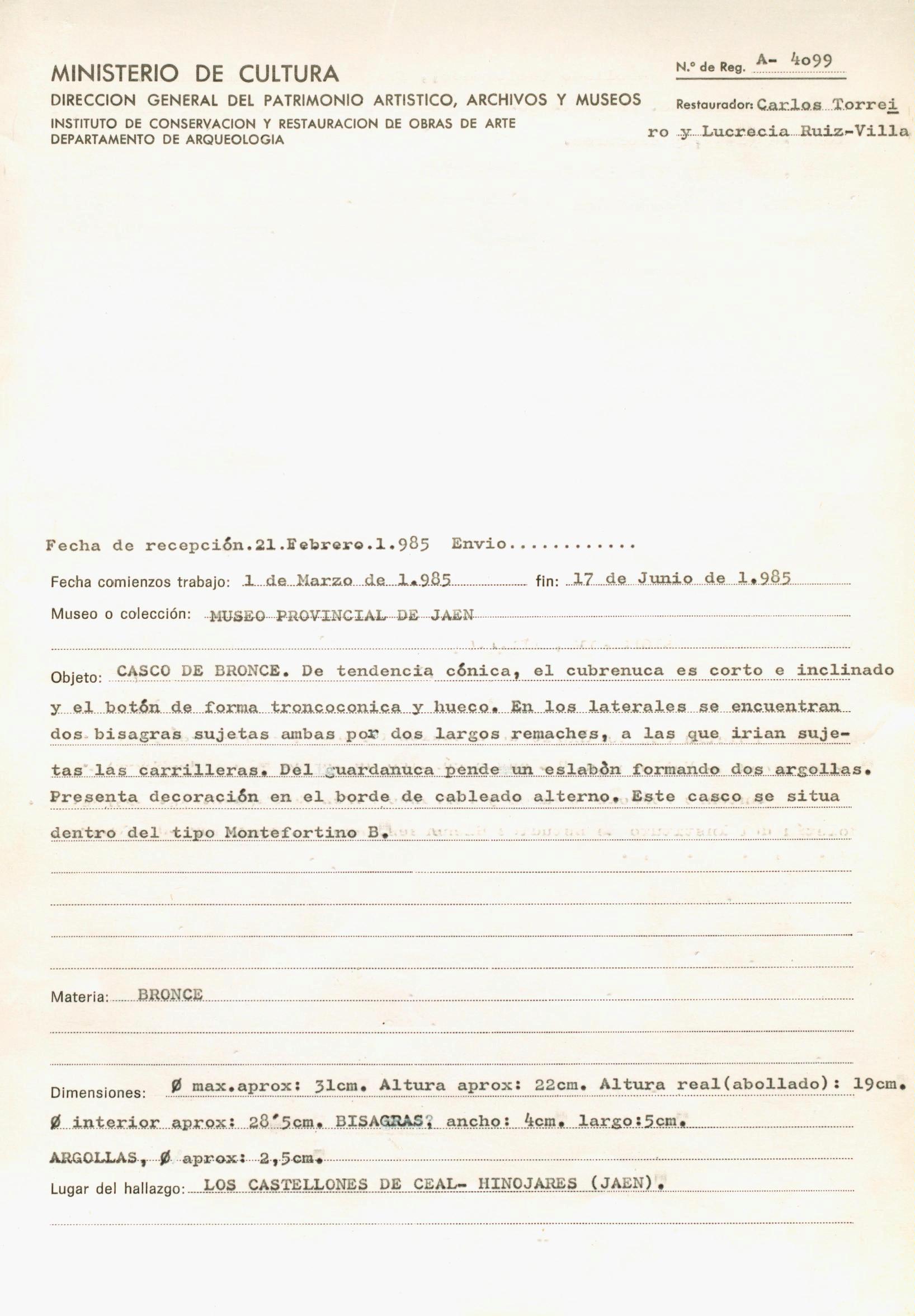 Restauración de un casco de bronce procedente del yacimiento de los Castellones de Ceal Hinojares. Museo Arqueológico Provincial de Jaén