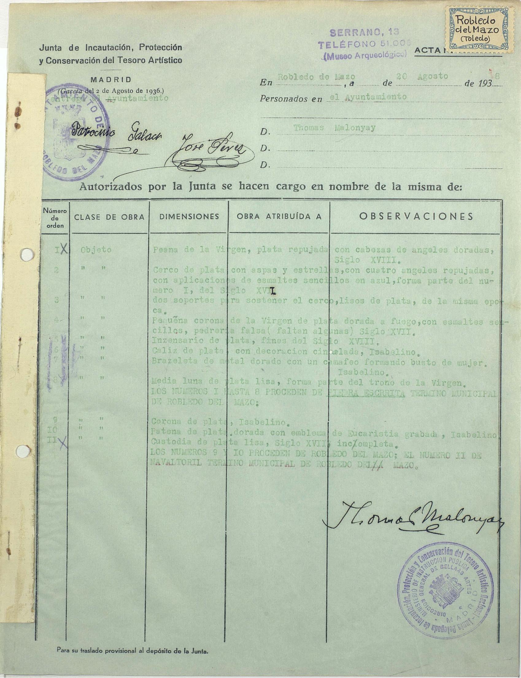 Acta de incautación de Robledo del Mazo (Toledo)