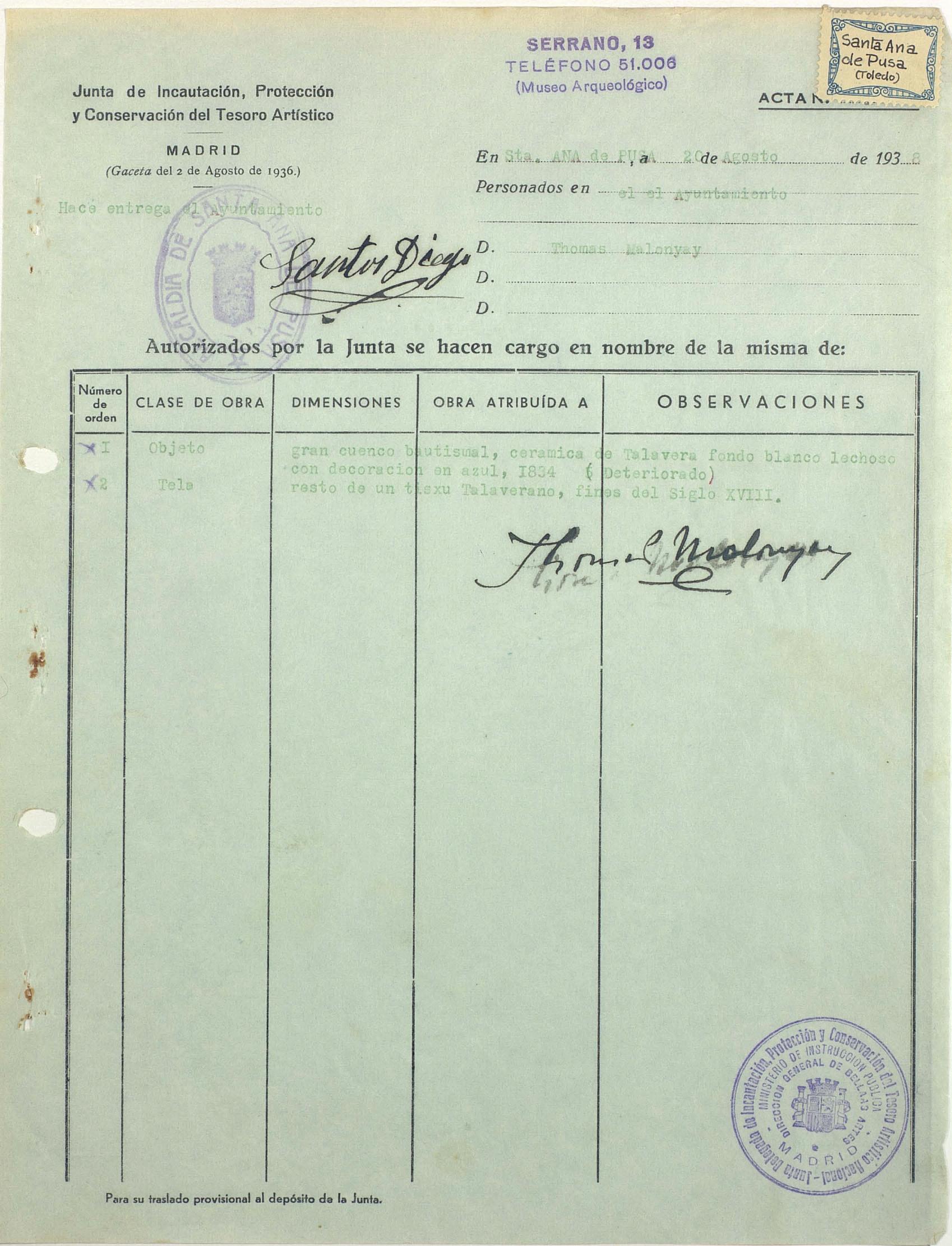 Acta de incautación de Santa Ana de Pusa (Toledo)