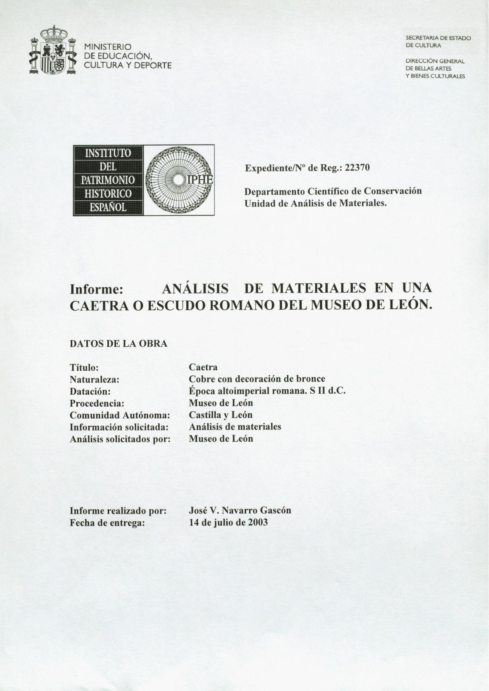Informes de laboratorio de una caetra o escudo y una placa dorada con panoplia militar romanas, procedentes del Museo de León