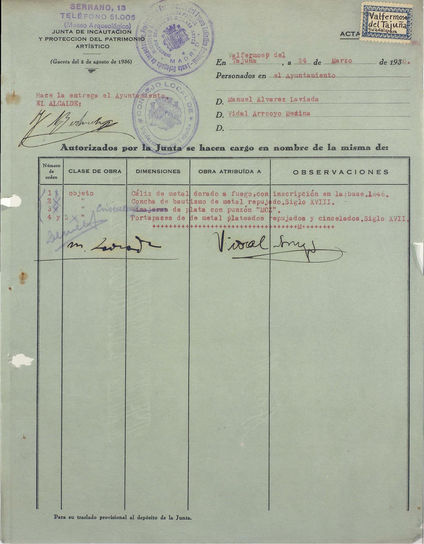 Acta de incautación de Valfermoso del Tajuña (Guadalajara)