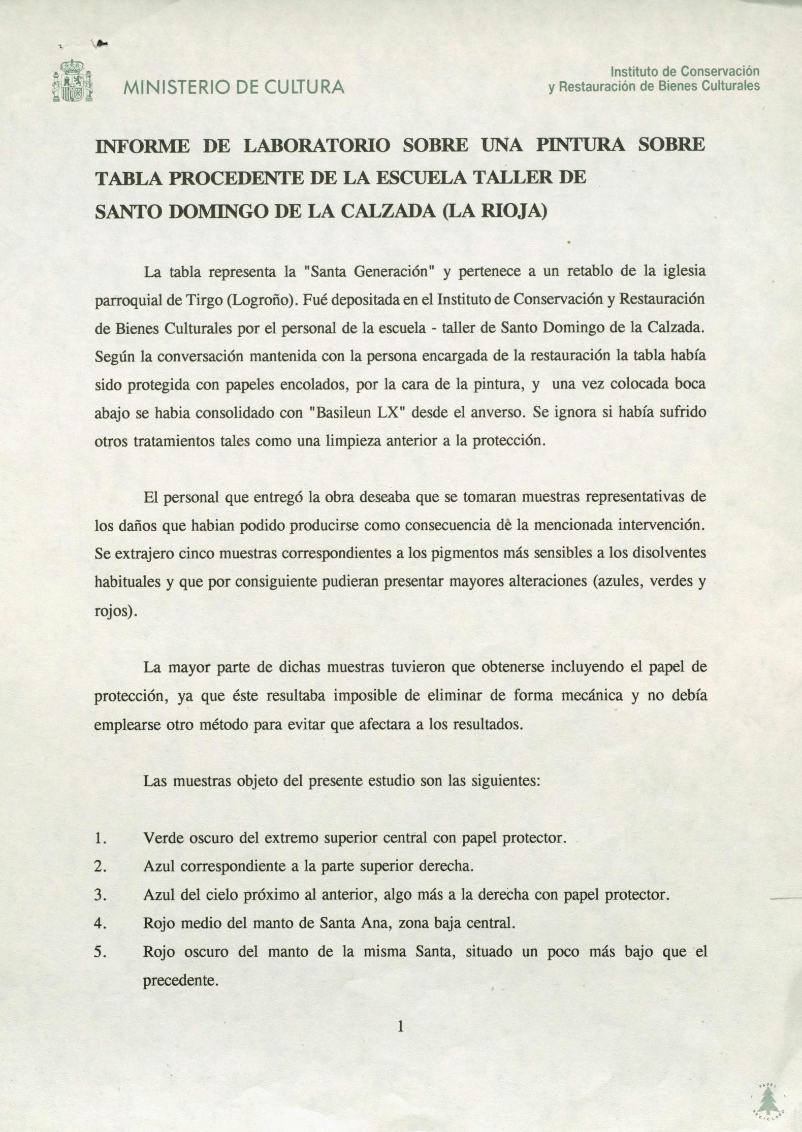 Informe sobre el análisis químico de la "Santa Generación", pintura sobre tabla de Andrés de Melgar, depositada por la Escuela Taller de Santo Domingo de la Calzada, procedente de la Iglesia parroquial de Tirgo (La Rioja)