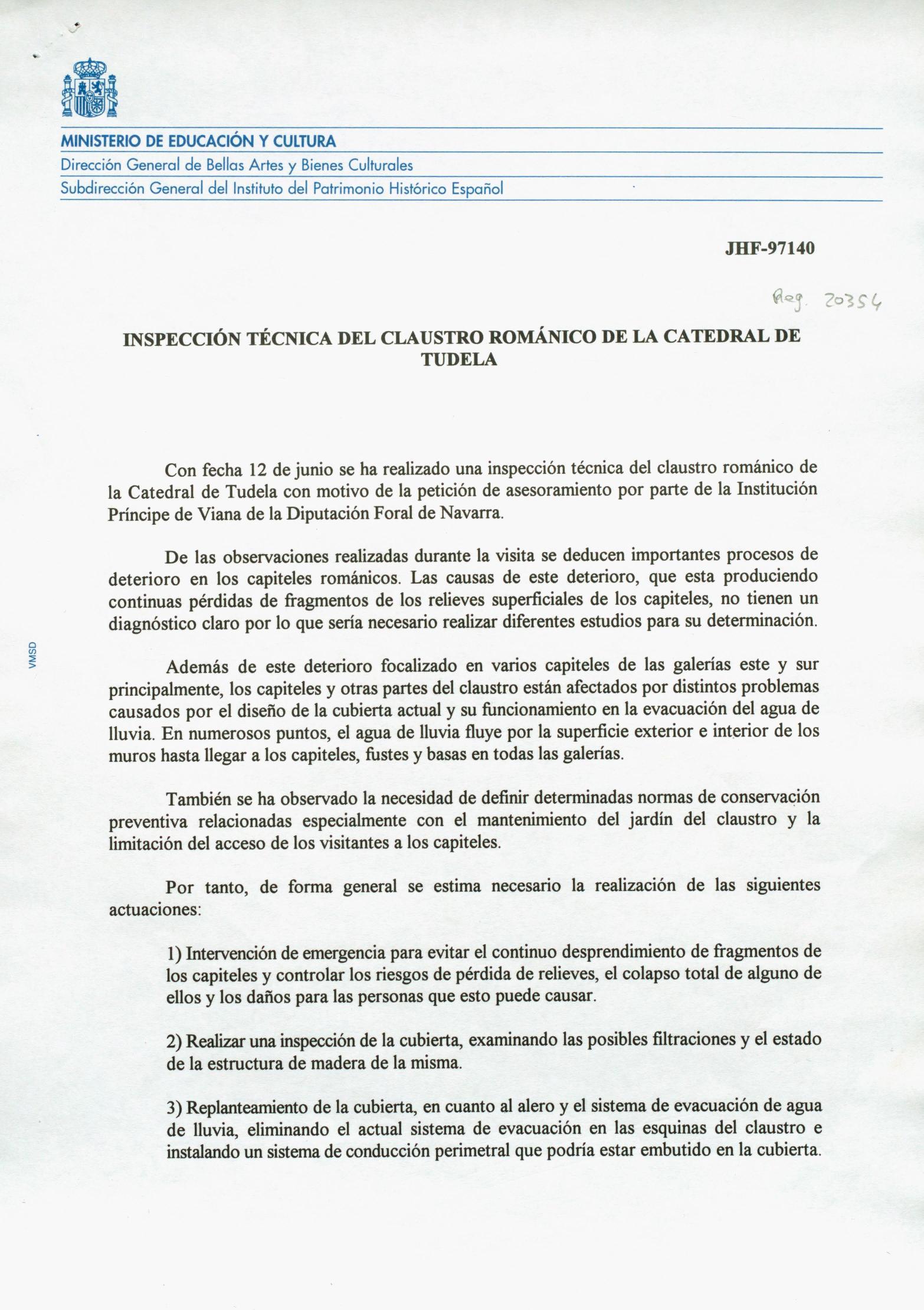 Informe de visita sobre la inspección del claustro románico de la Catedral de Tudela (Navarra)