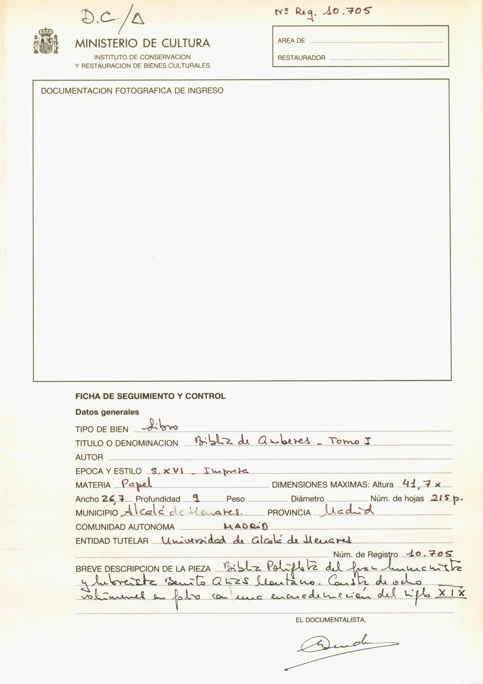Restauración de seis tomos de una Biblia Políglota y seis tomos de una Biblia de Amberes, procedentes de la Universidad de Alcalá de Henares (Madrid)