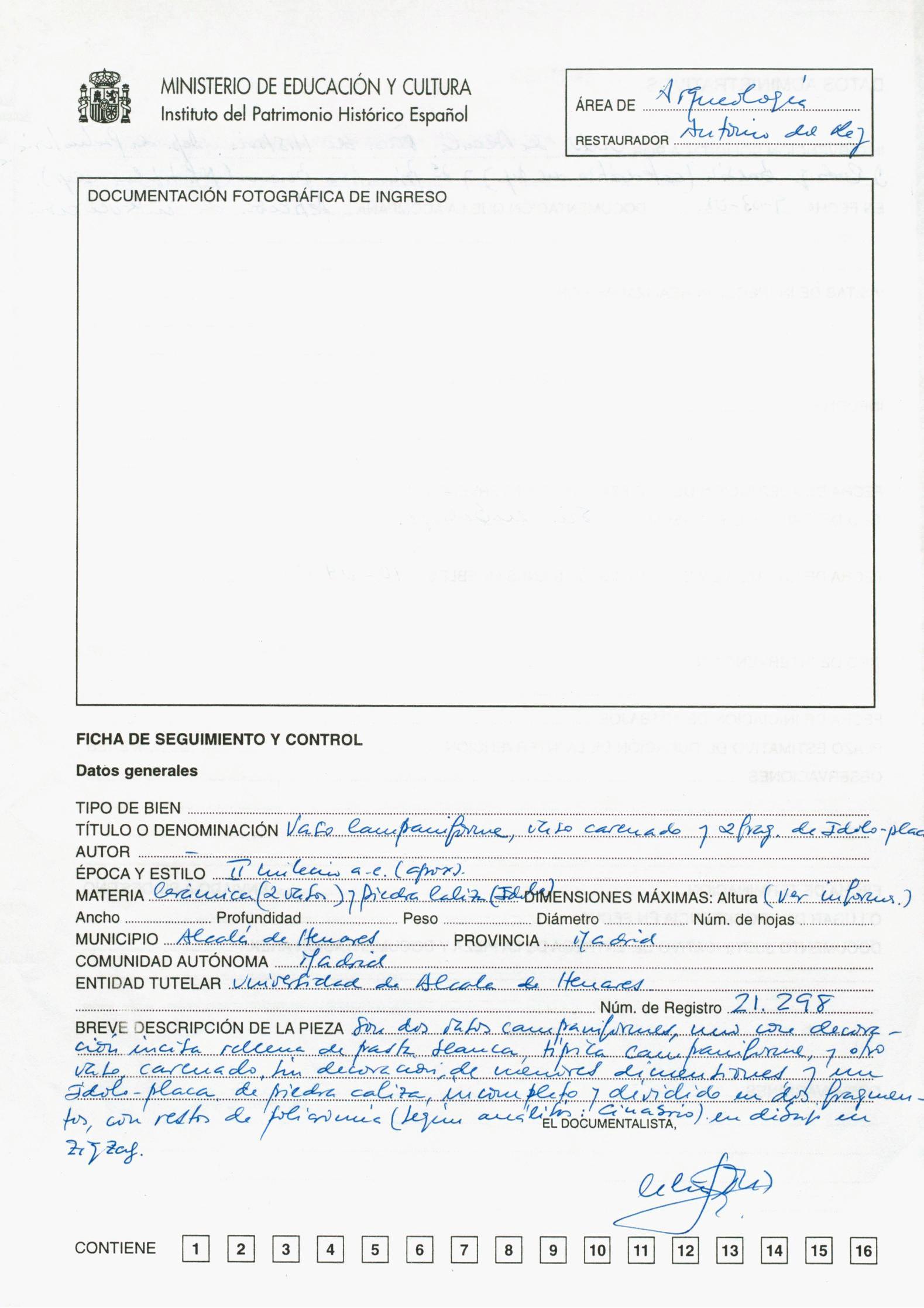 Restauración de un vaso campaniforme, un vaso carenado y dos fragmentos de un ídolo-placa, procedentes de la Universidad de Alcalá de Henares (Madrid)