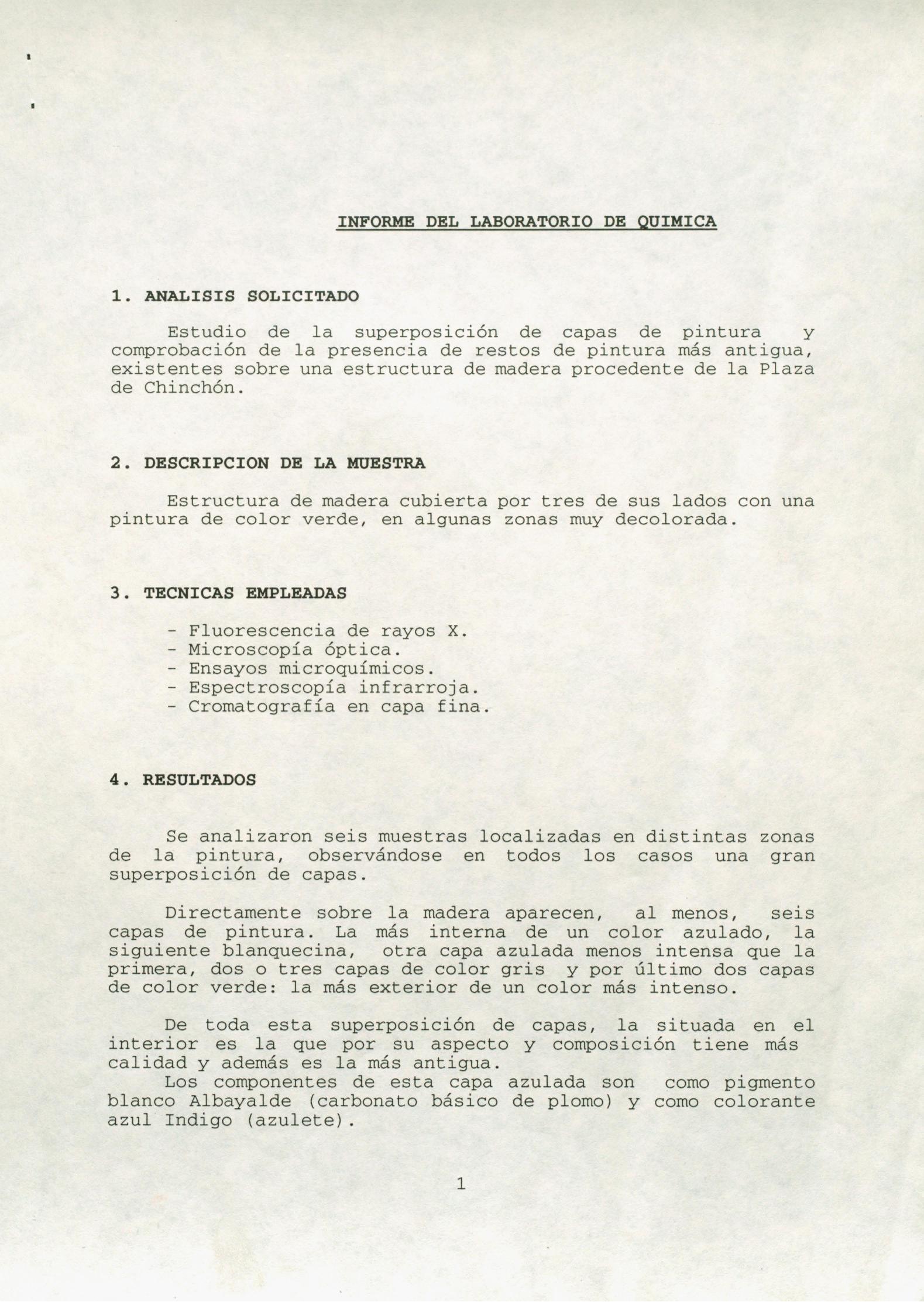 Informe de laboratorio sobre el estudio químico de capas de pintura y restos más antiguos existentes sobre una estructura de madera procedente de la Plaza de Chinchón (Madrid)