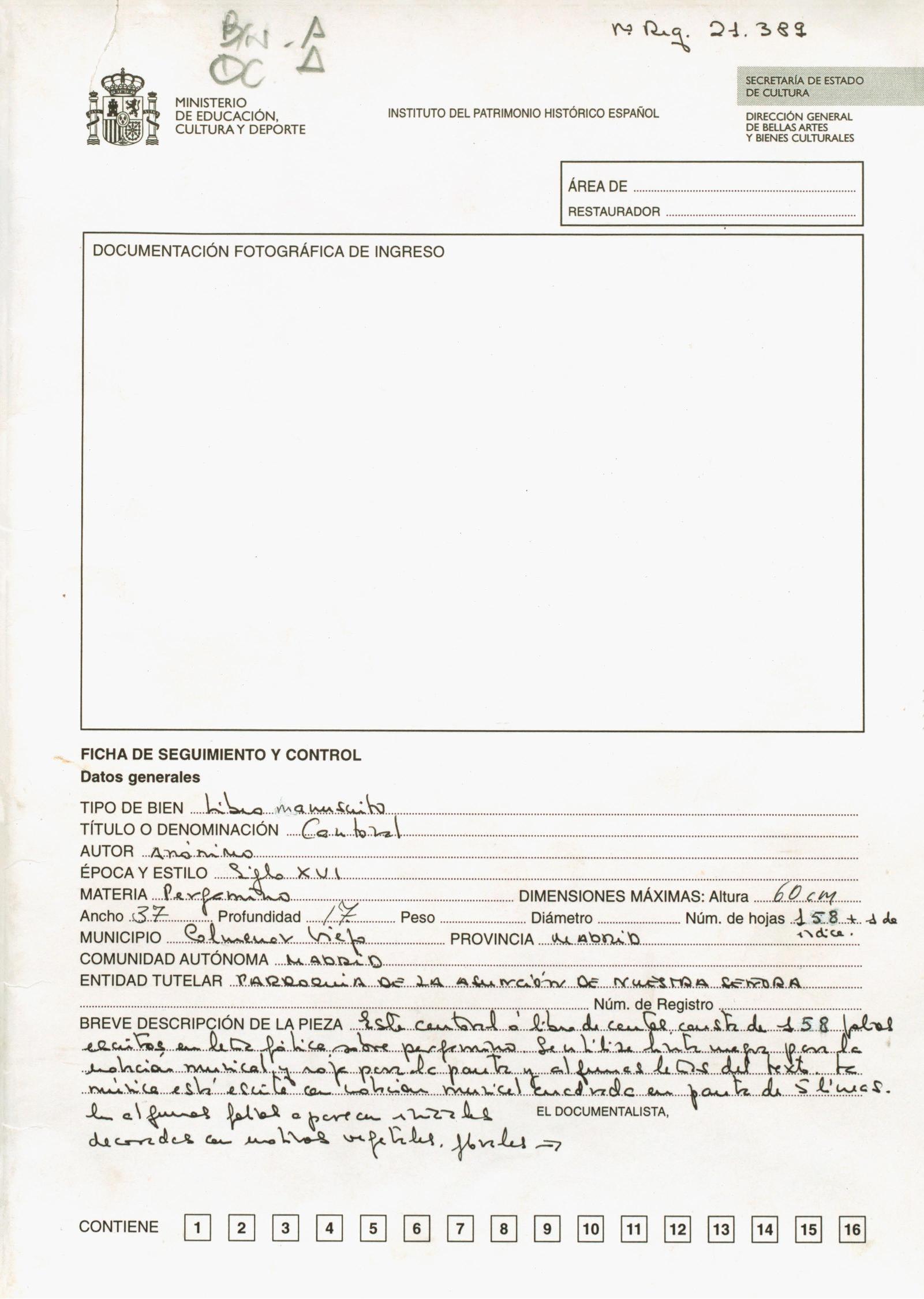 Restauración de un cantoral del siglo XVI de la escuela castellana, procedente de la Iglesia parroquial de Nuestra Señora de la Asunción de Colmenar Viejo (Madrid)