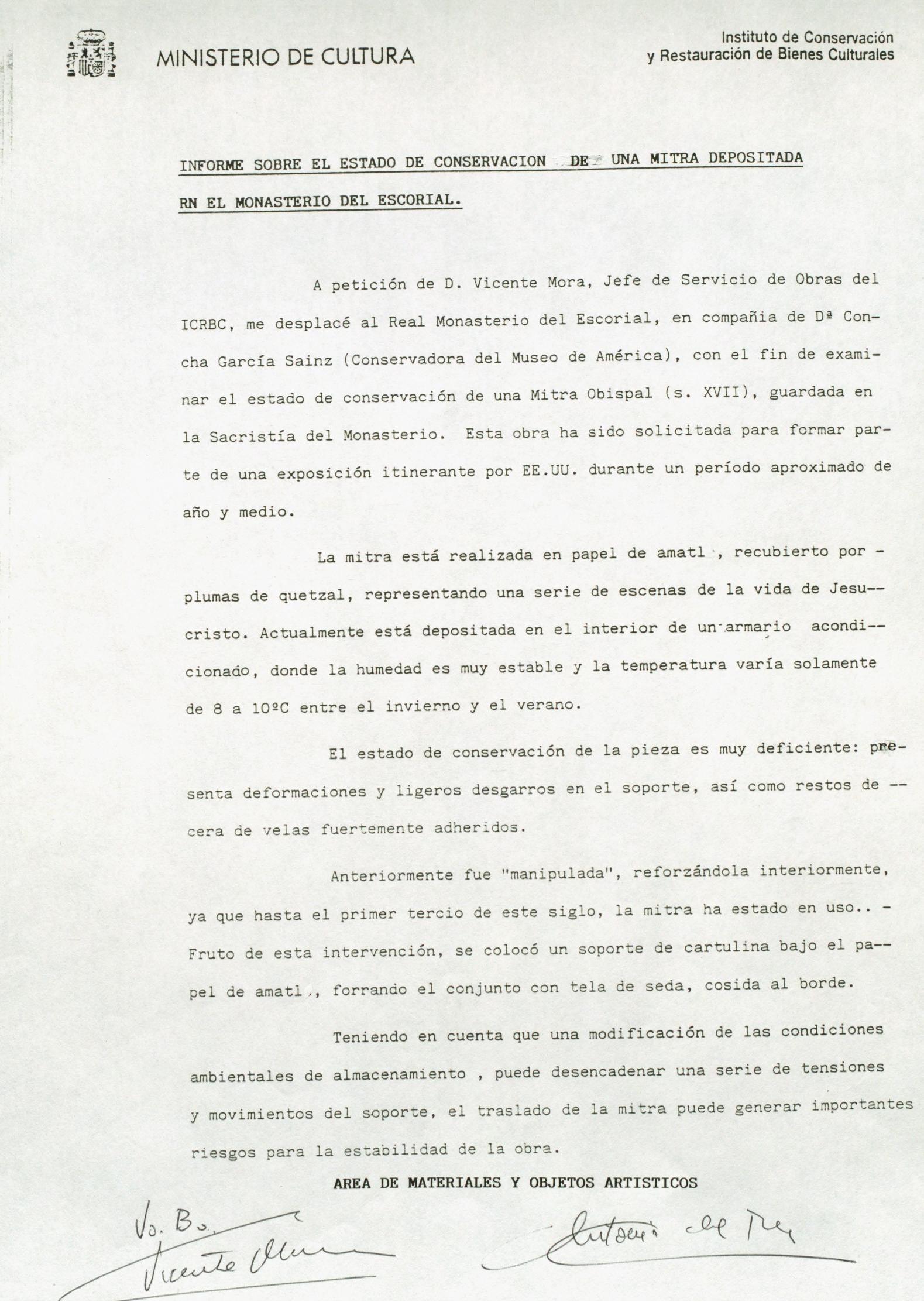 Informe de visita de una mitra de plumas del siglo XVI procedente de San Lorenzo de El Escorial (Madrid)