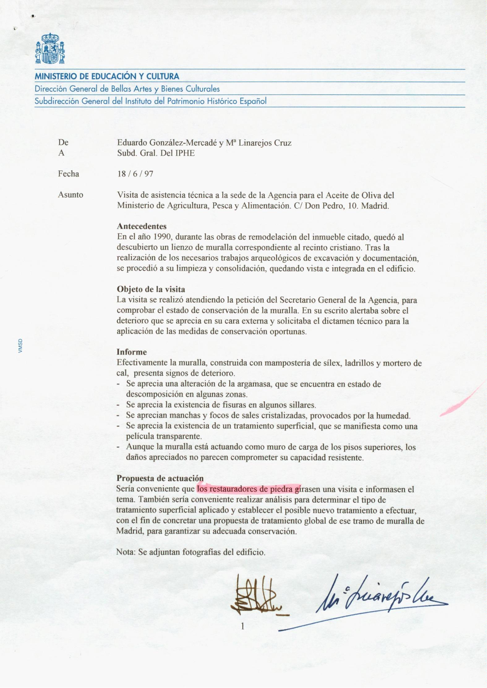 Informe de visita y de laboratorio para la conservación de un lienzo de muralla hallada en la sede de la Agencia para el Aceite de Oliva del Ministerio de Agricultura, Pesca y Alimentación (Madrid)