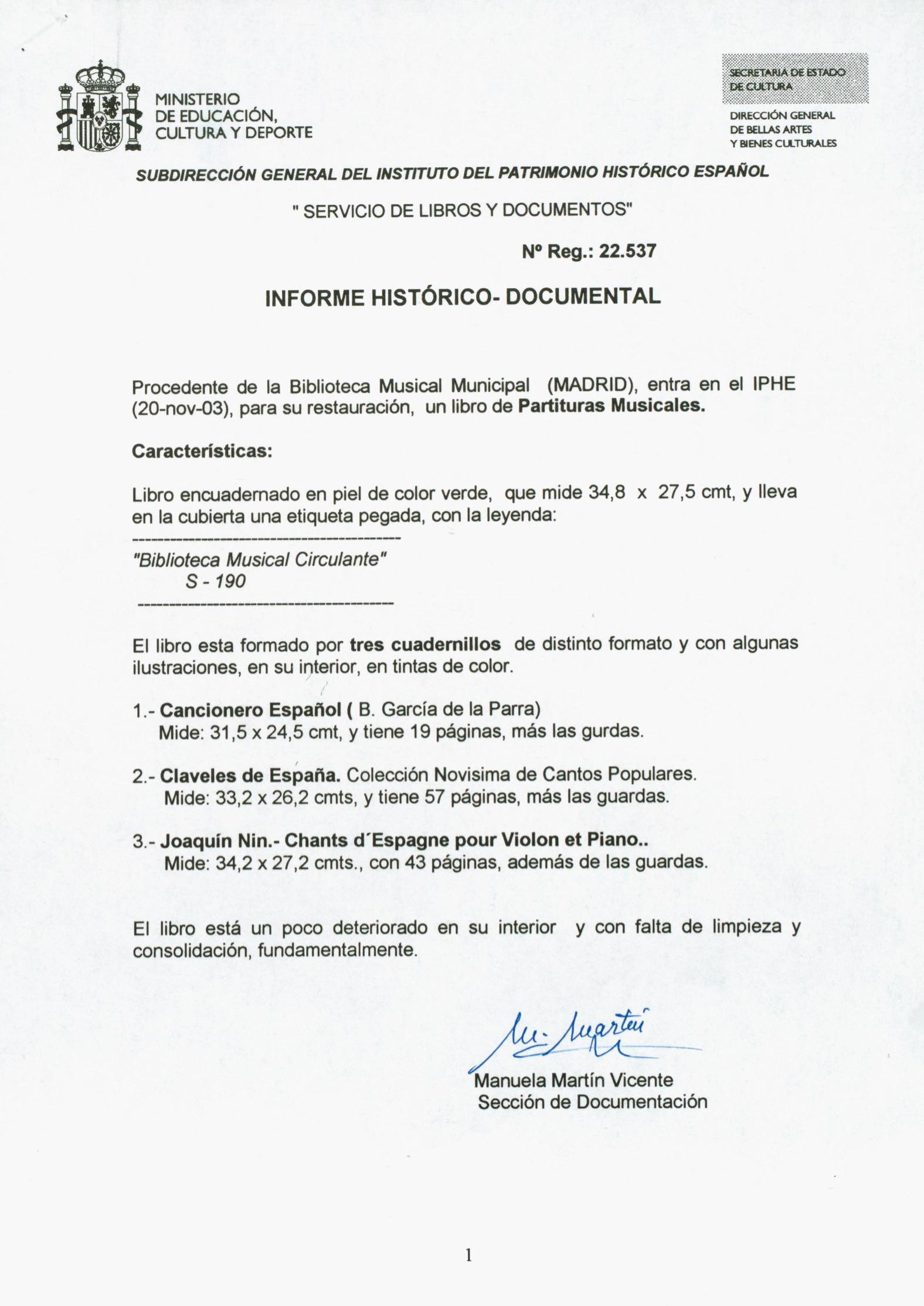 Informes histórico-artístico de un libro compuesto por tres cuadernillos musicales, procedente de la Biblioteca Musical de Madrid
