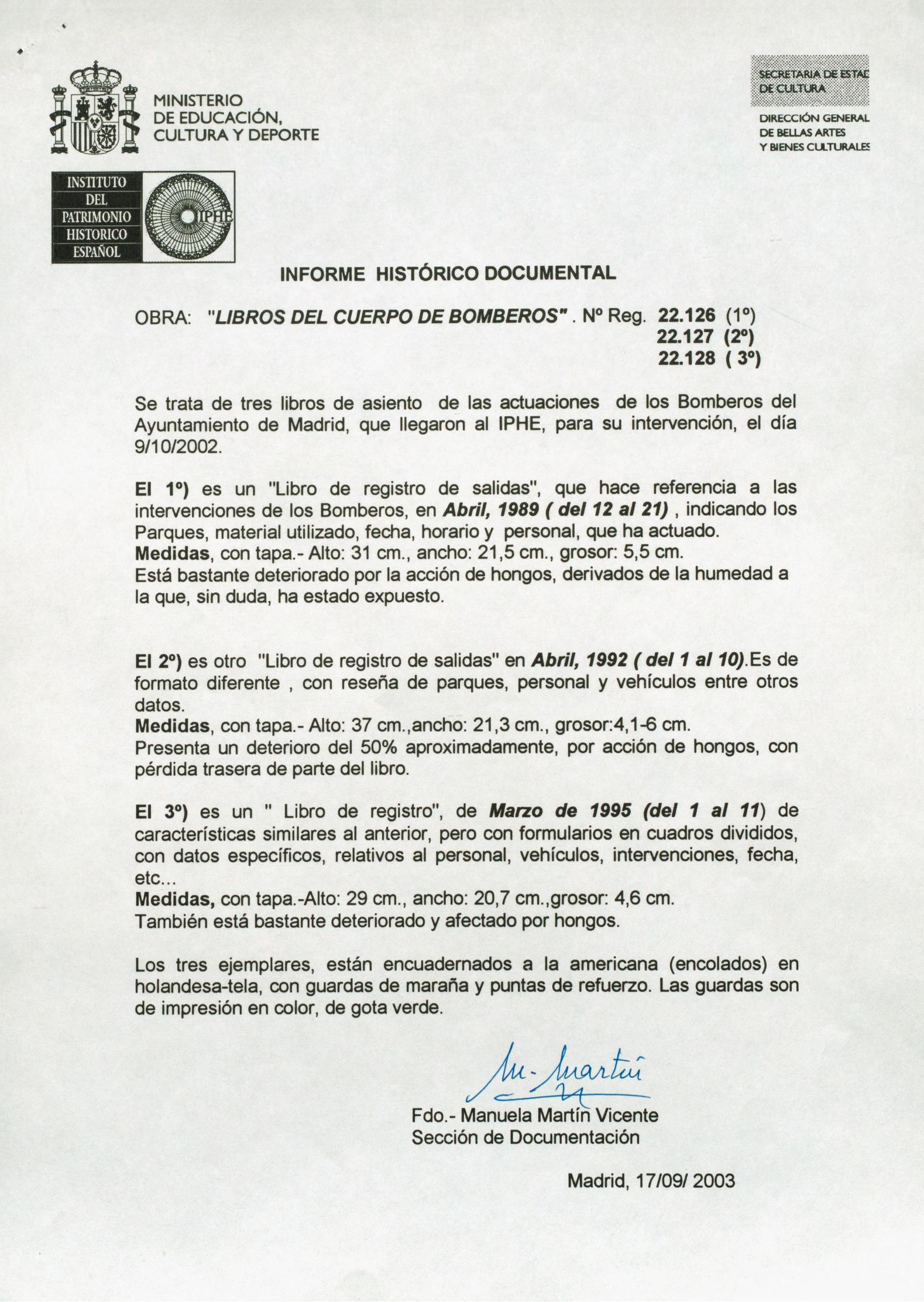 Restauración y desinfección de tres libros de registro del Cuerpo de Bomberos, procedentes del Servicio de Extinción de Incendios del Ayuntamiento de Madrid