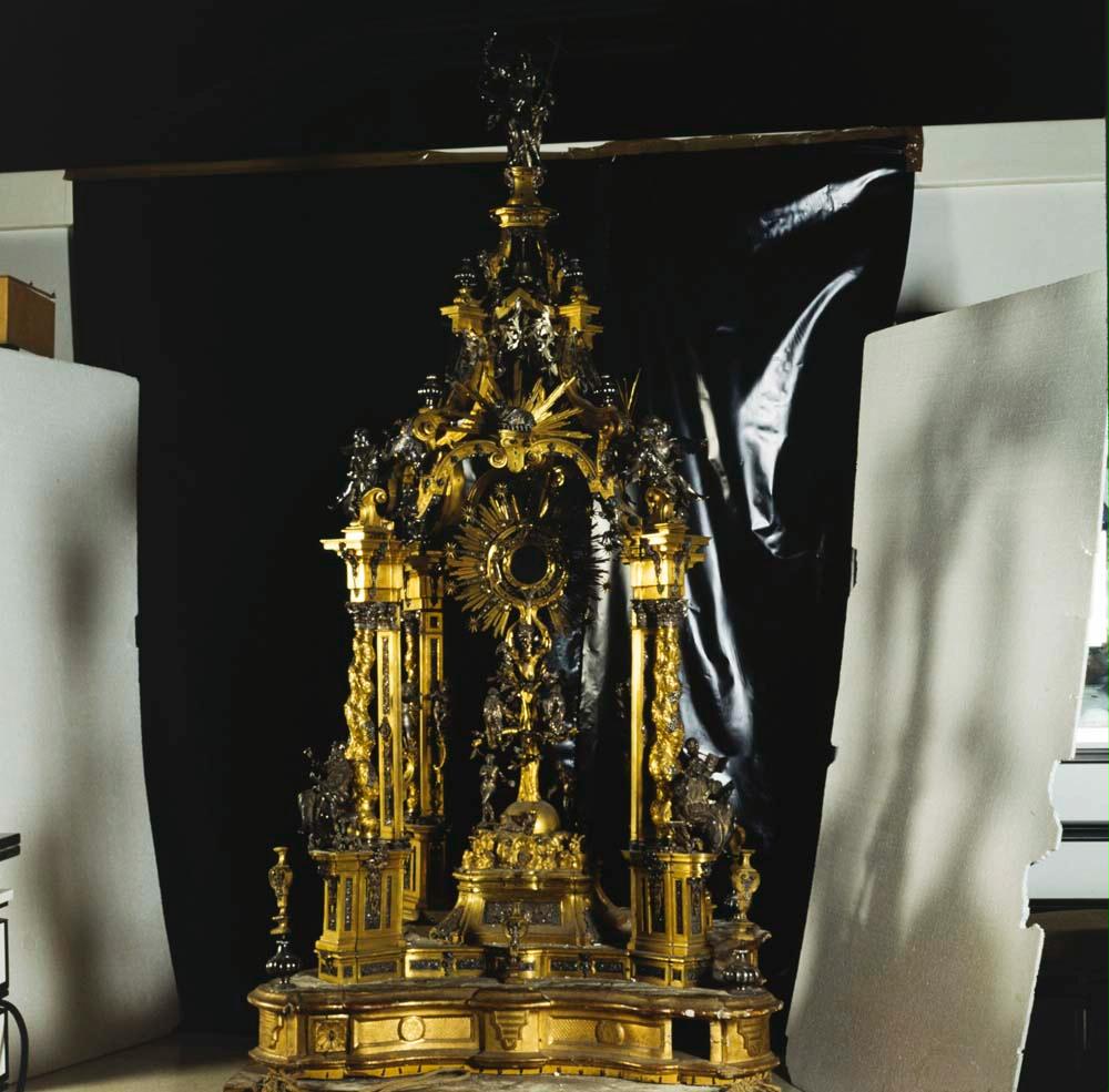 Restauración de una custodia procesional barroca, en latón y cobre dorados, procedente de la Catedral de la Almudena y propiedad Arzobispado de Madrid