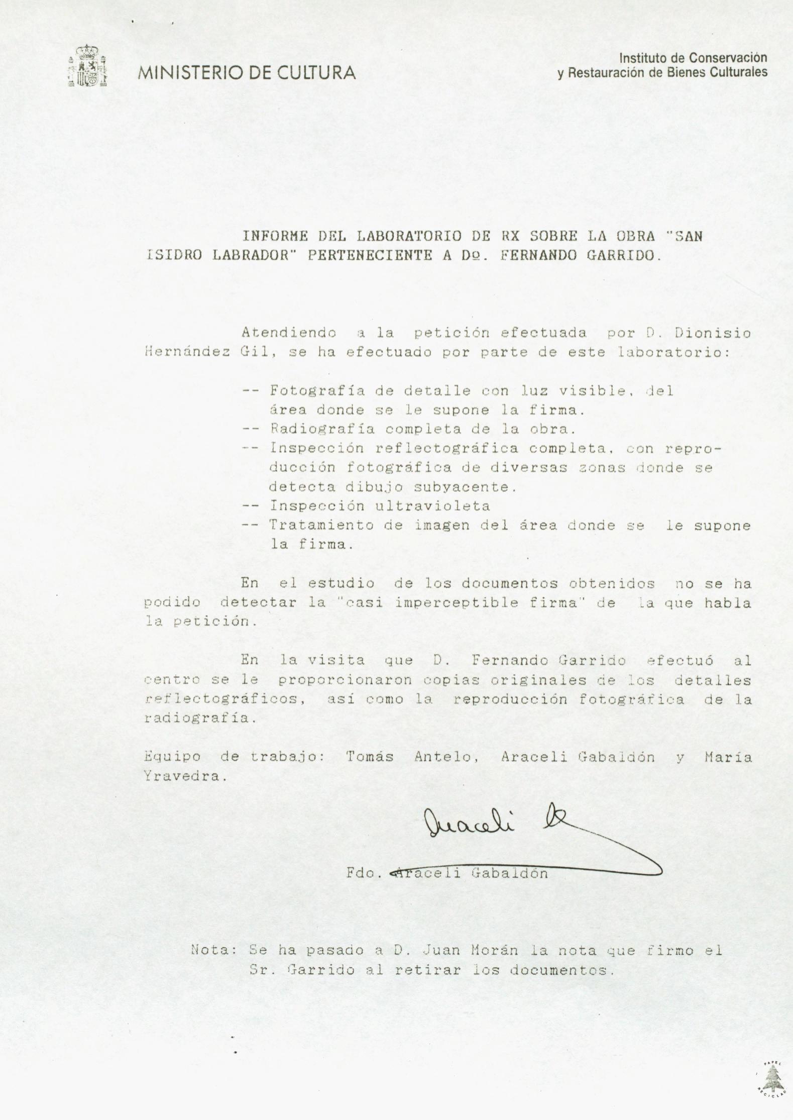 Informes de laboratorio del cuadro "San Isidro Labrador", atribuido a Goya y procedente de la colección particular de Fernando Garrido en Madrid