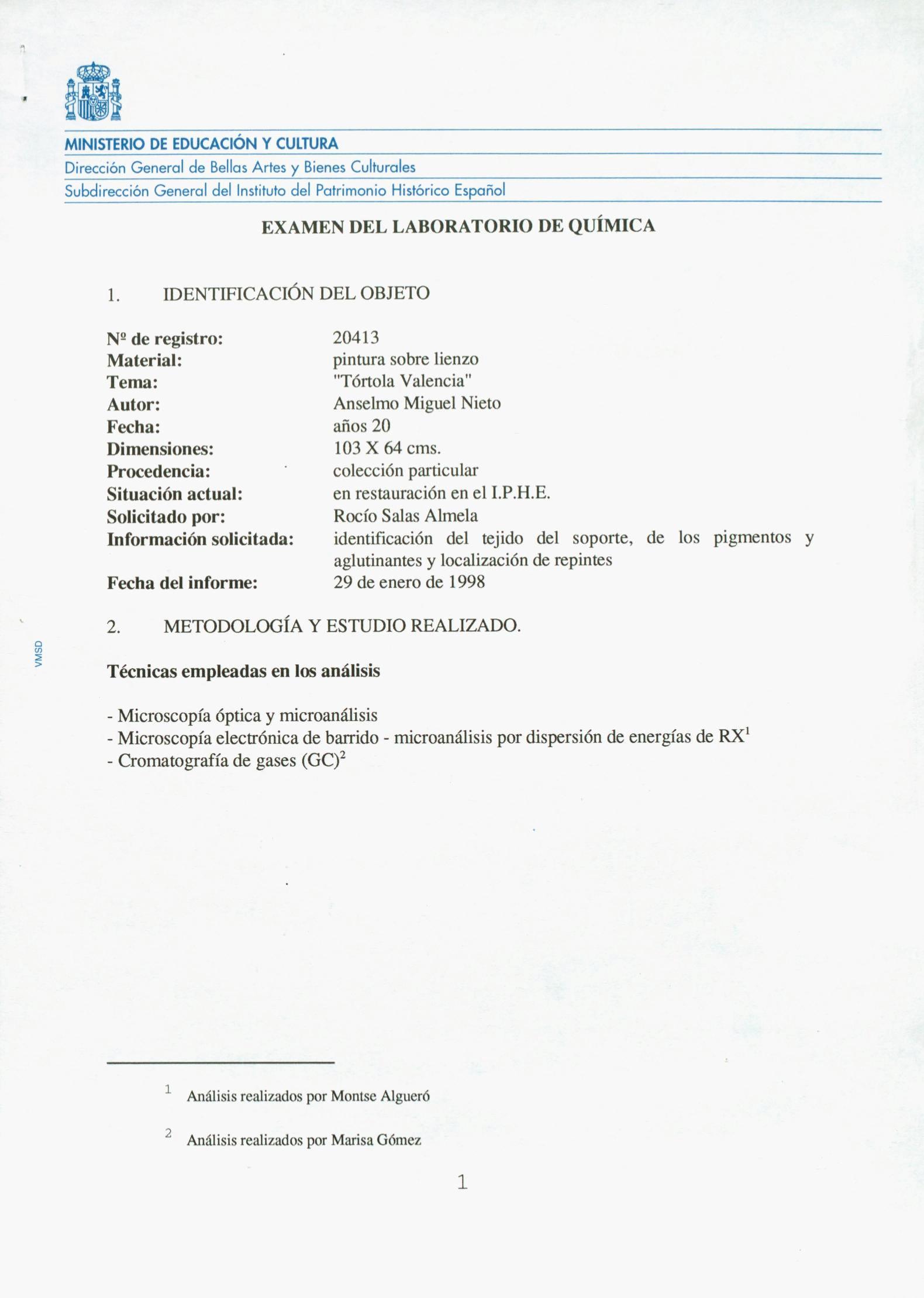 Informe sobre el análisis químico del lienzo "Tórtola Valencia", de Anselmo Miguel Nieto, de la colección particular de Liliana Mantovani (Madrid)