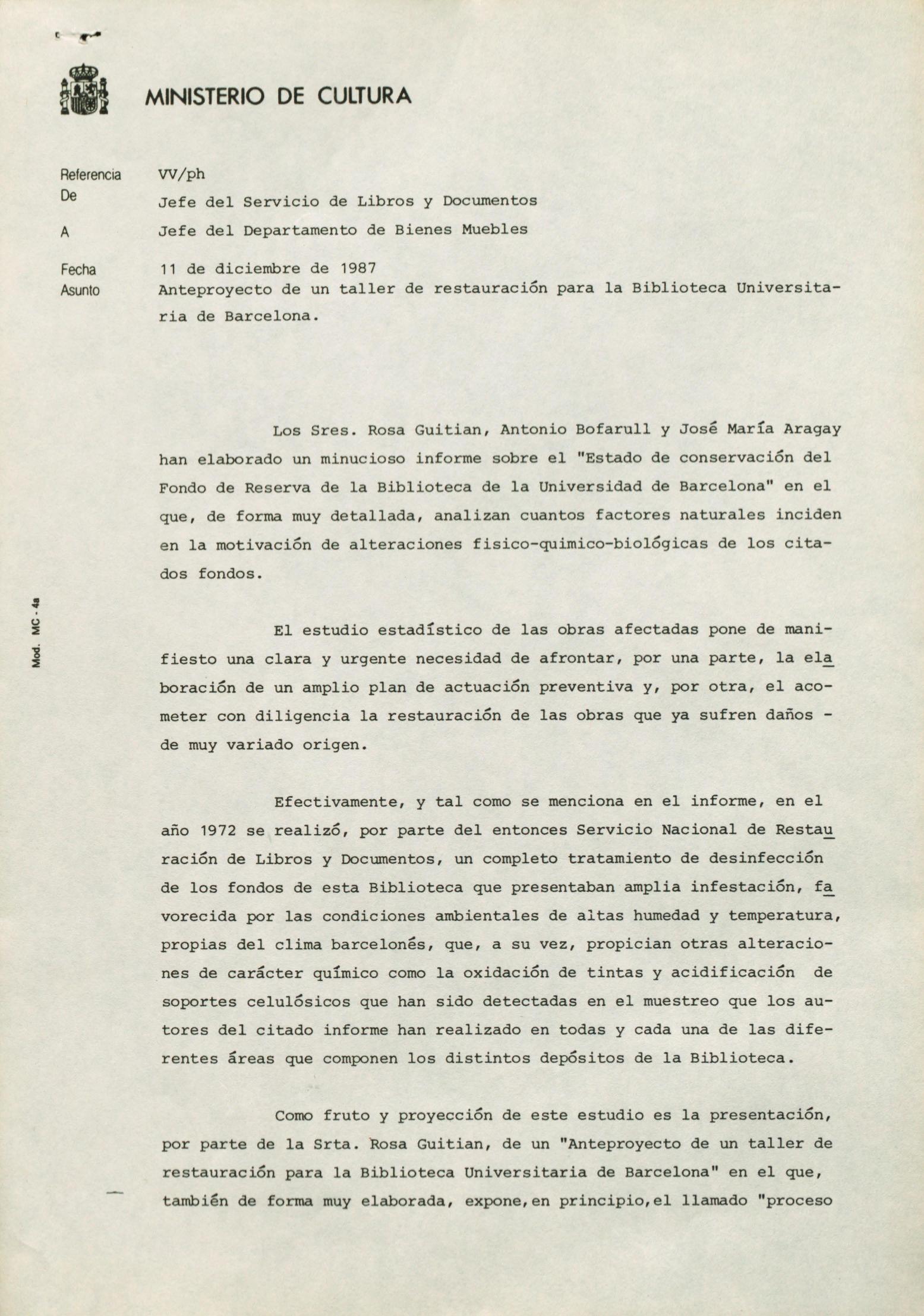 Informe sobre el asesoramiento al anteproyecto de un taller de restauración para la Biblioteca de la Universidad Central de Barcelona